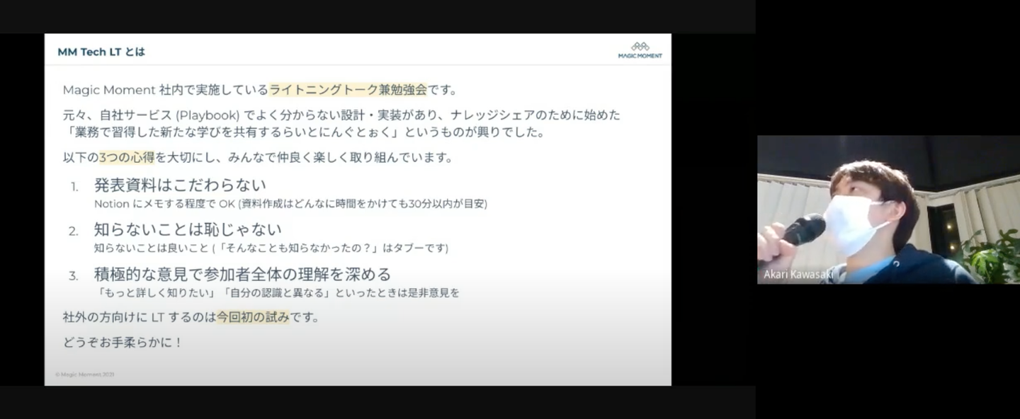 - 概要:発表者は立候補形式。事前に発表したいコンテンツを集め、最低2-3名の発表者が集まった際に開催。Magic Moment Playbook の開発において各スクラムチームがどのような設計・実装を行なっているのかナレッジをシェアするために開始