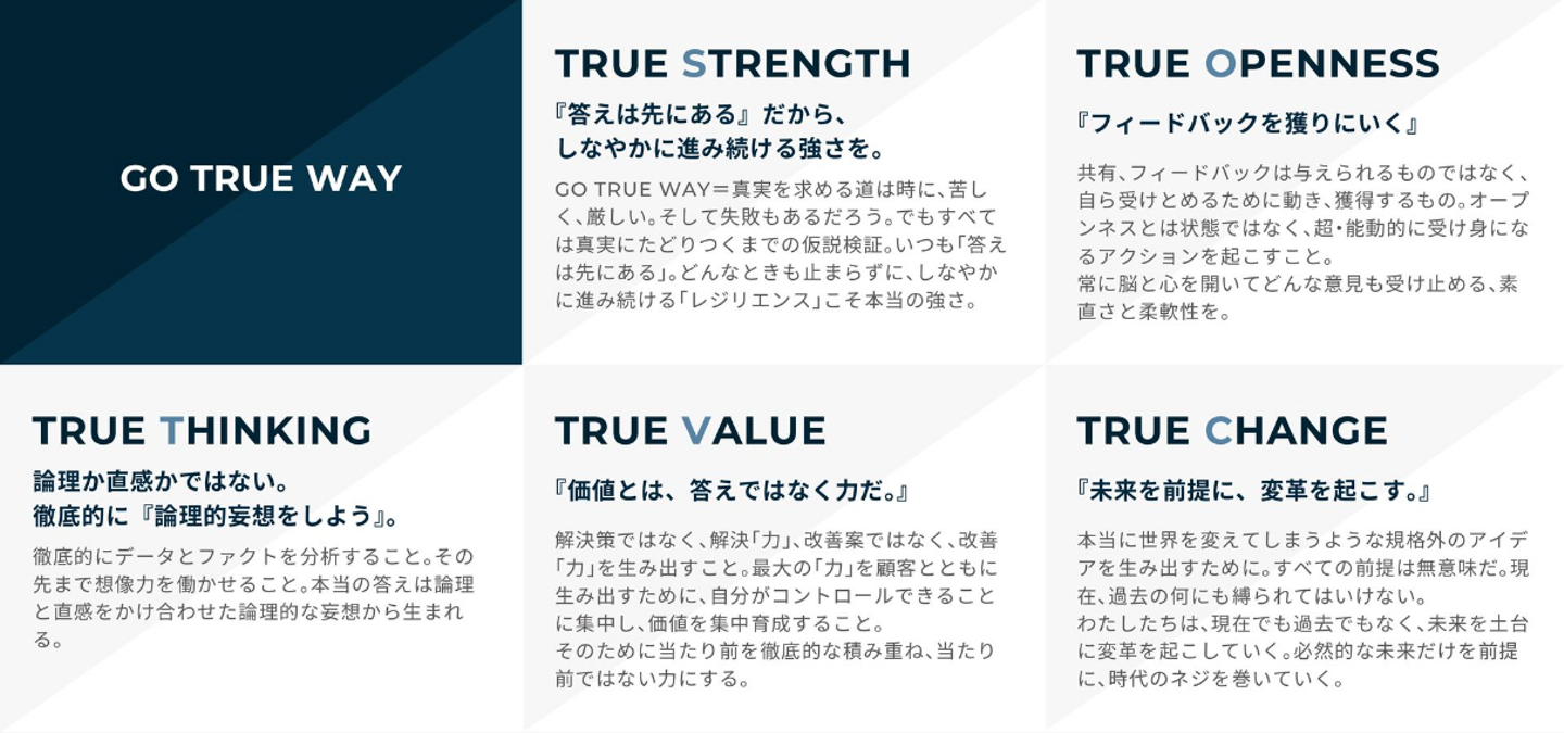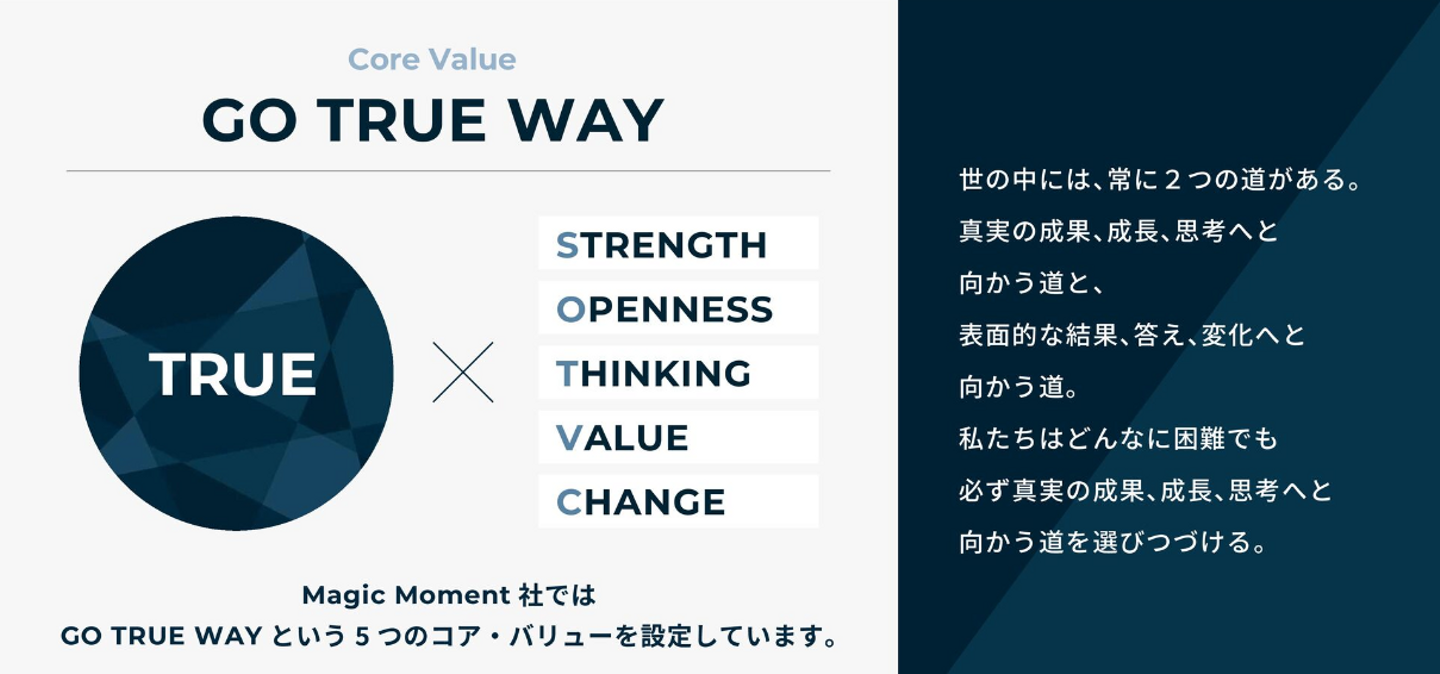 Magic Moment では、Core Value に"GO TRUE WAY" を設定しており、全員が TRUE に真剣に向き合い、そうありたいという思いを持ち続けています。