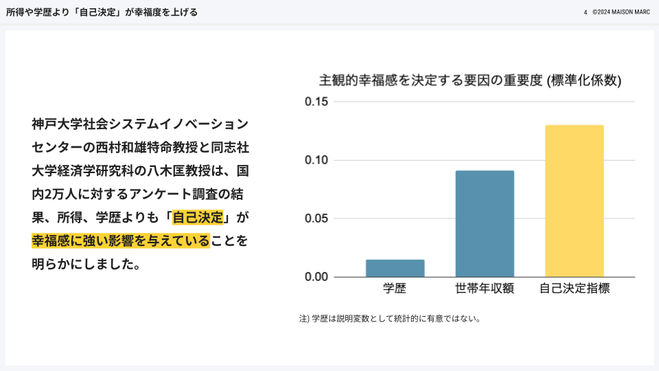 私たちの幸せは「自己決定」と定義しています。年収や学歴といった指標よりも自己決定のほうが幸福感に影響を与えると研究結果が出ているほどです。