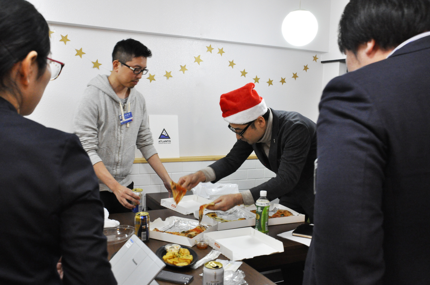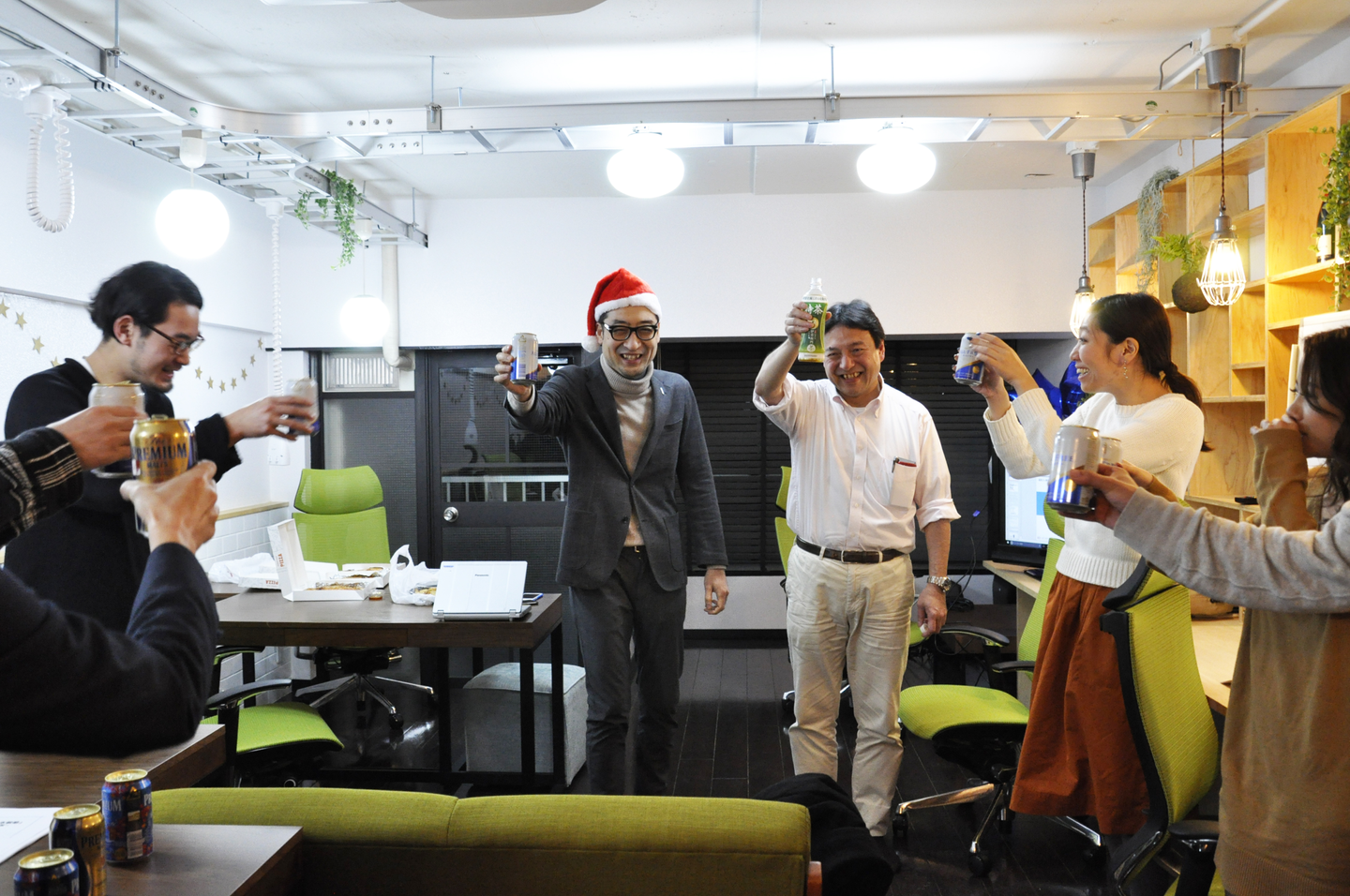 ちょうどクリスマスだったこともあり、サンタも登場。代表の向畑からは、美味しいケーキの差し入れが!勉強会には参加できなかった社員も加わり、素敵なクリスマスパーティーとなりました。