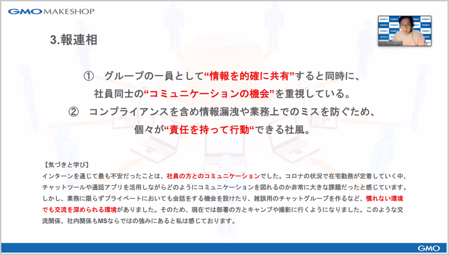 今回は、社長付とコンサル・ディレクションチームを兼任している中村さん、社長付の小林さんの2人から発表してもらいました。フォーマットは決まっておらず、弊社での活動内容や学んだことについて自分なりの資料へ落とし込み自由に発表をしてもらいましたが、2人とも分かりやすくまとめられていて素敵な発表でした。
