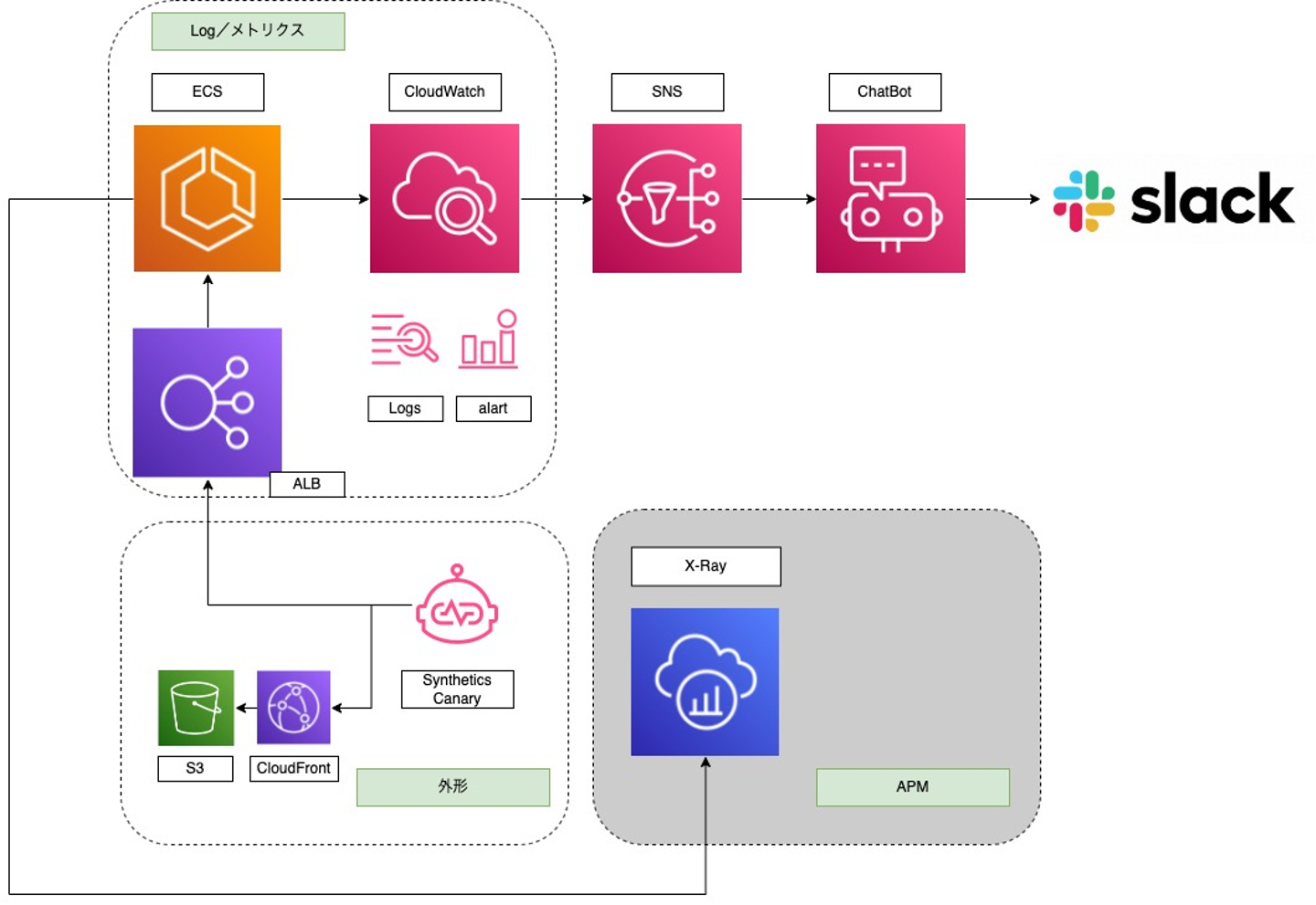 - ログレベルがエラー以上のログ:CloudWatchLogs→CloudWatchメトリクスフィルター→CloudWatch Alarm→SNS→Chatbot→Slack