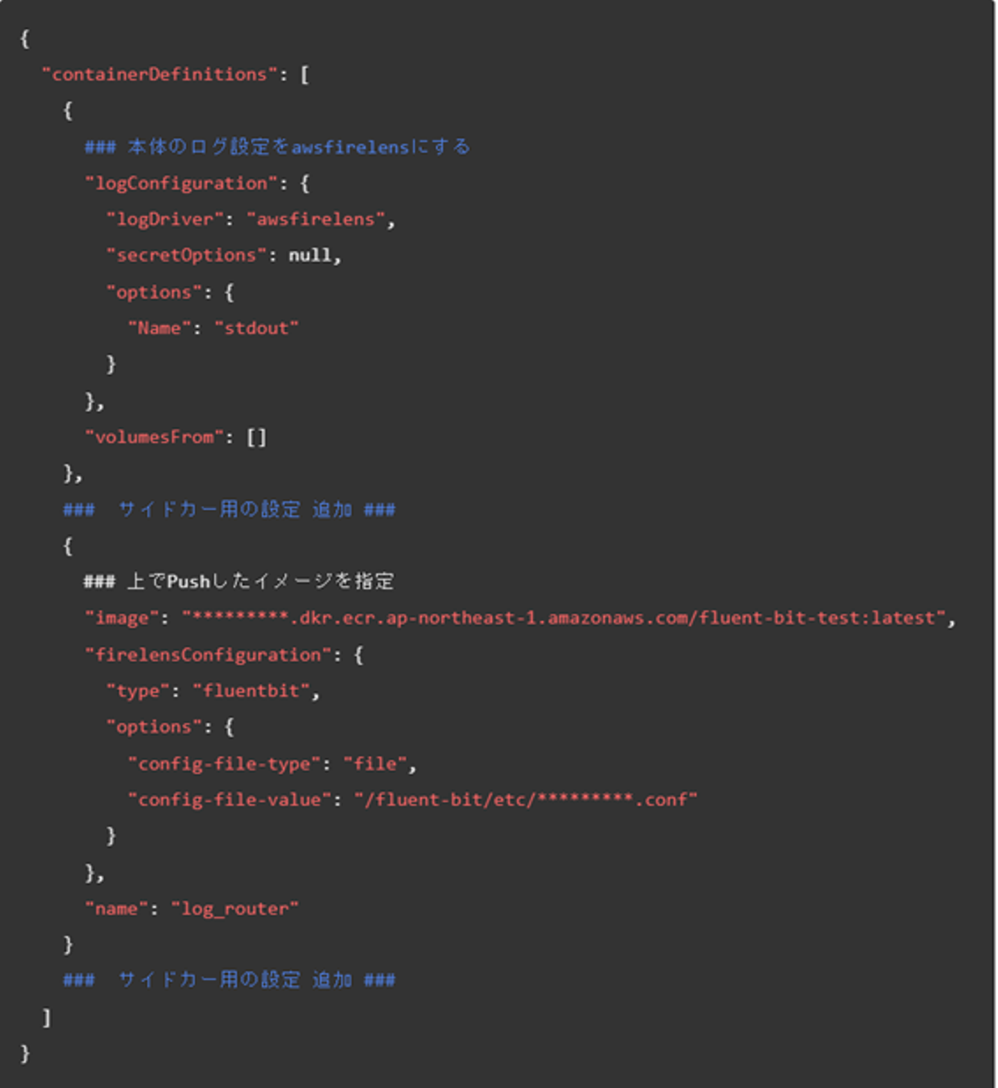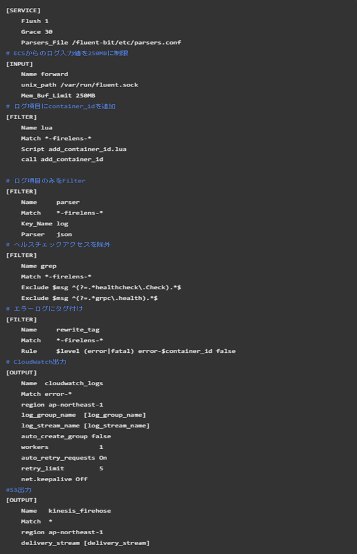 confファイルは大体こんな感じで用意しました。OutPutの部分で切り分けています。 こちらのDockerfileを使って、サイドカー用のイメージを作成し、ECRにPushします。