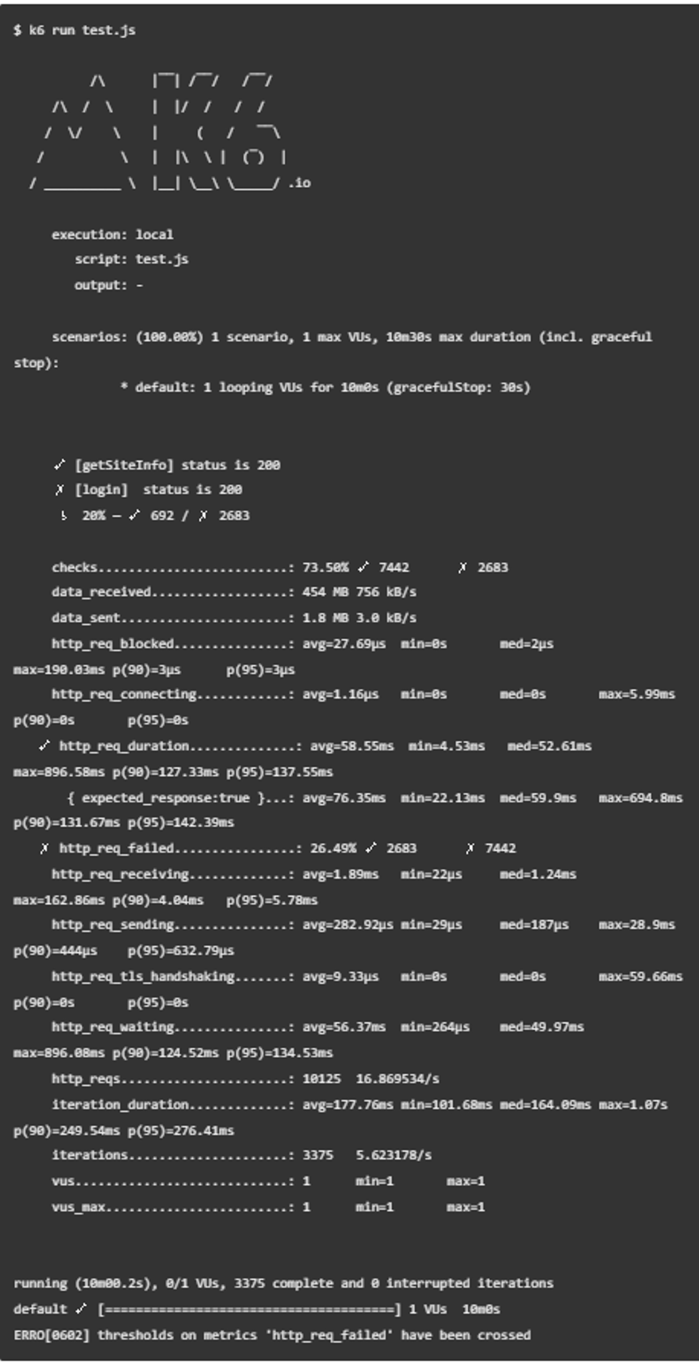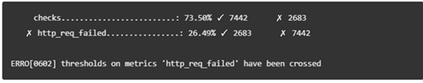 リクエストの失敗率が26.49%、thresholdsで定義したエラー率5%を上回ったためhttp_req_failedに✗がつき、最後にエラーメッセージが表示されています。