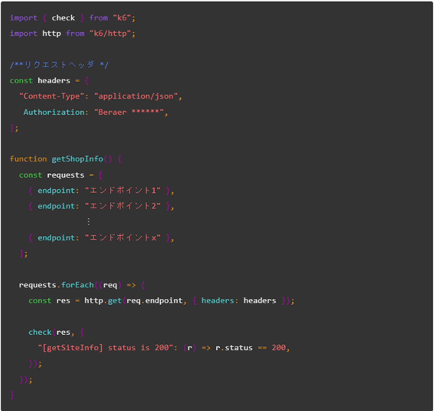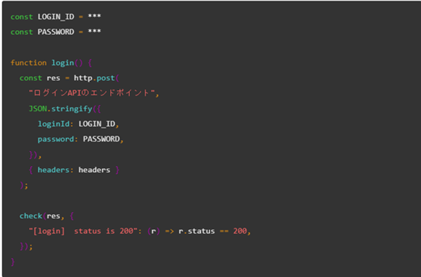 APIレスポンスからcheck() 今回はAPIレスポンスを確認してステータスが200なら成功、それ以外が返ってきたら失敗と判定するよう定義します。http、check共にk6に含まれるモジュールですのでimportする必要があります。