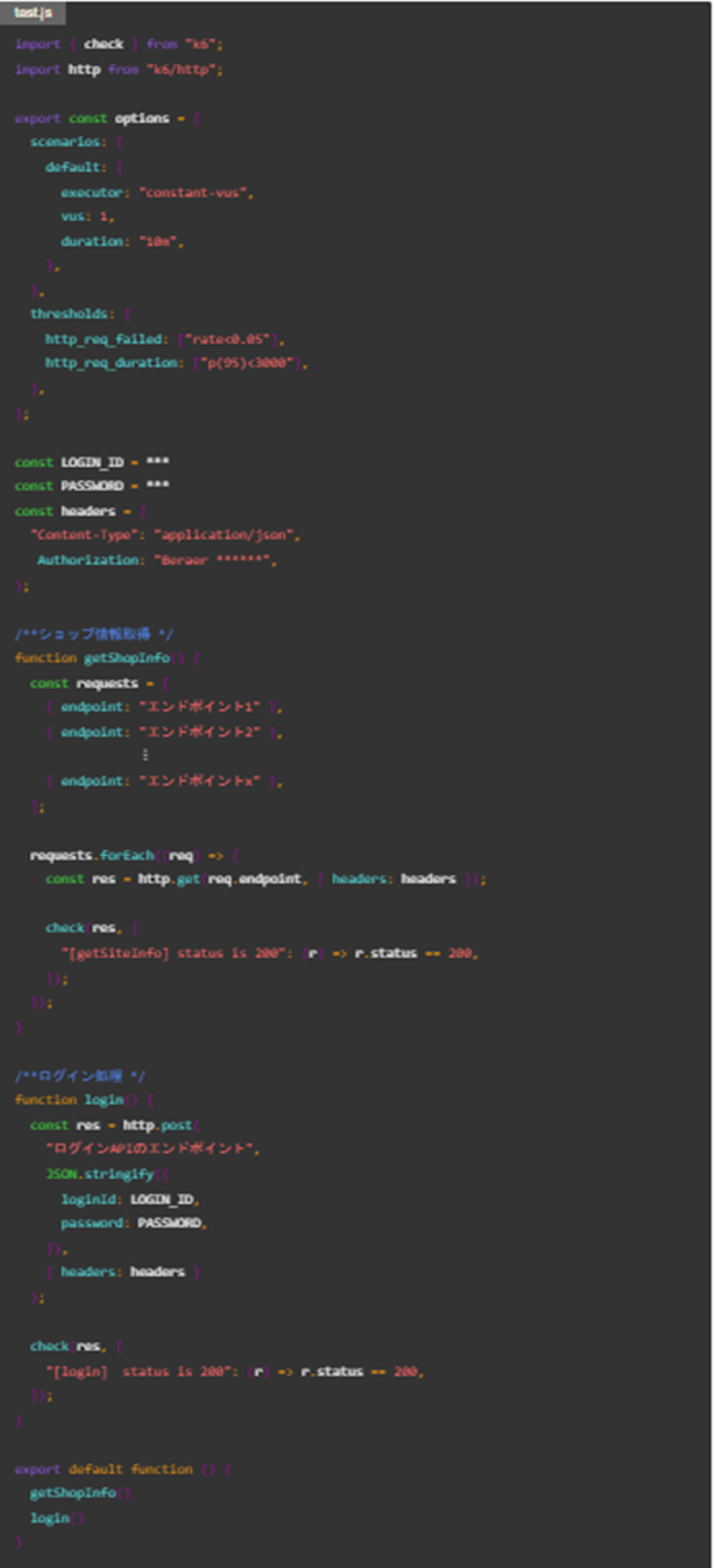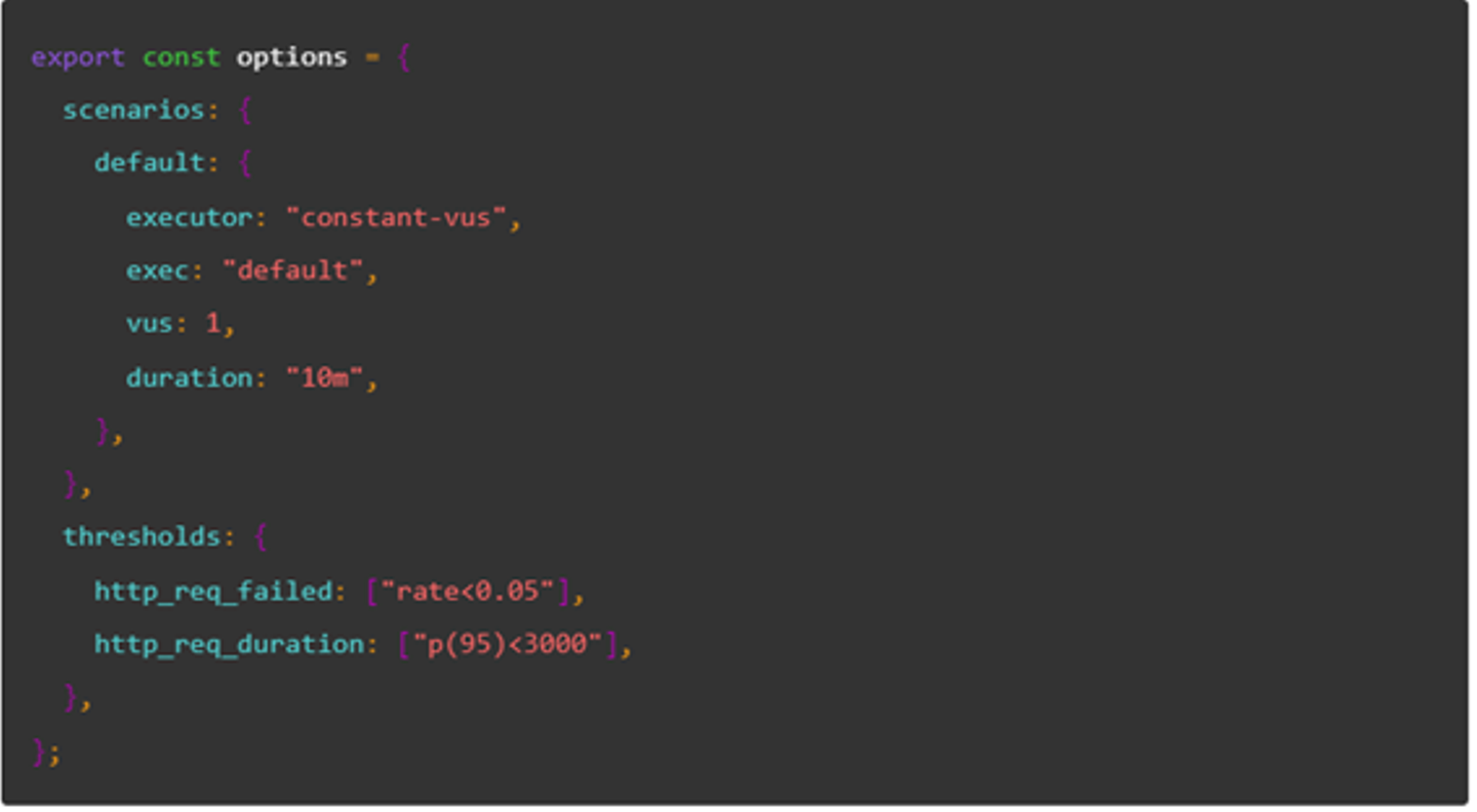 thresholdsには負荷試験の合格条件を記述します。プロジェクトに合わせて適切に設定してください。