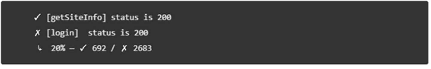失敗した場合は以下のように各check()毎に成功率 — ✓ 成功数 / ✗ 失敗数が表示されます。