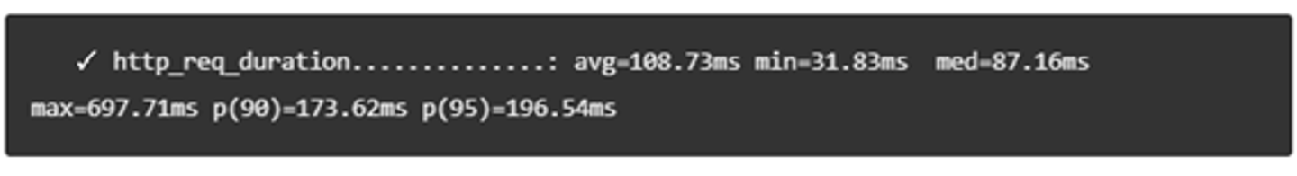 http_req_durationはリクエストにかかった時間とthresholdの定義に対する合否を表示しています。 今回の95%が3秒以内で定義したので p(95)の部分を見てみると、約0.2秒以内にリクエストが完了しており合格判定なので✓がついています。