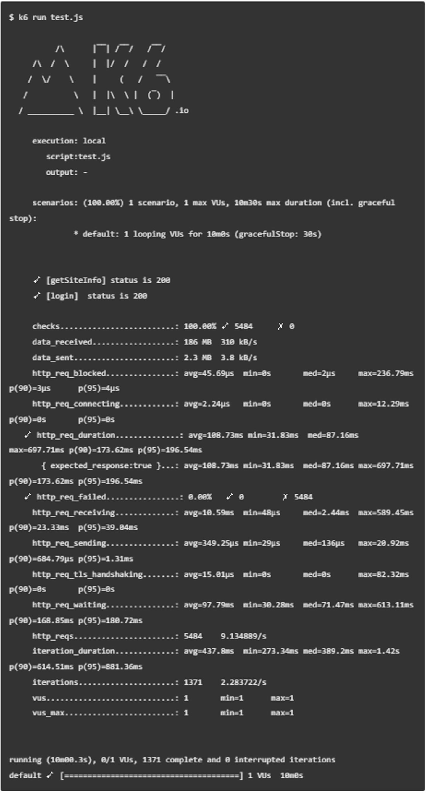 vus: 1:同時接続数、今回は1に設定duration: "10m":実行時間、今回は10分に設定