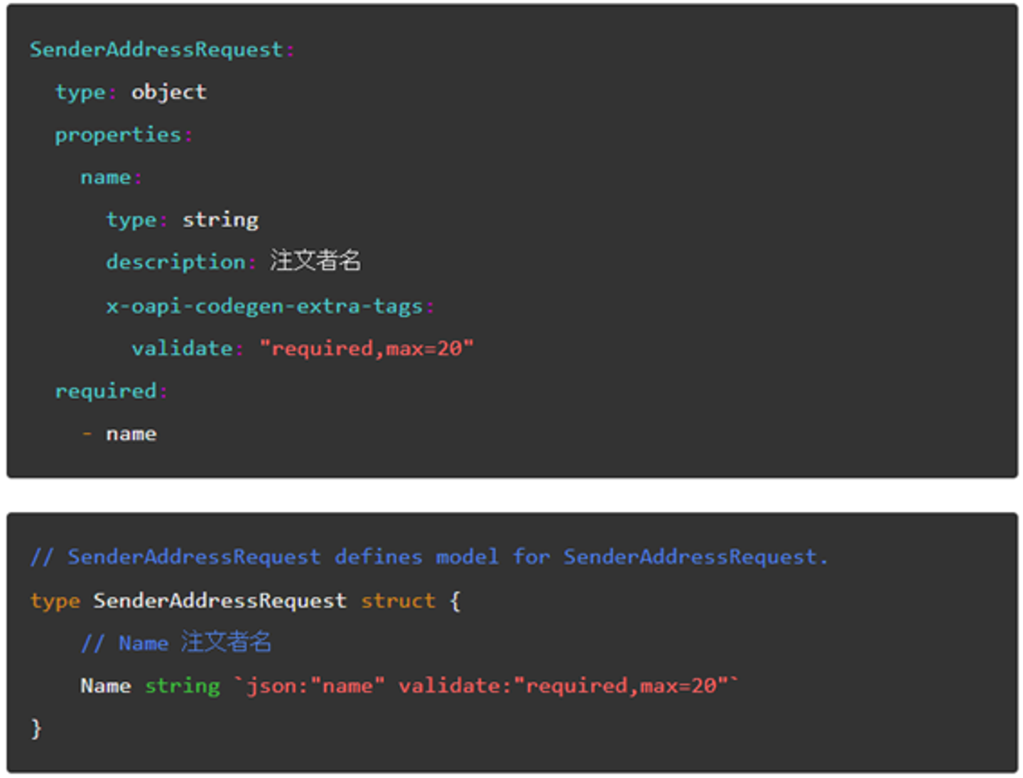 x-oapi-codegen-extra-tagsを利用することで、下記のように任意の構造体タグを追加することができます。 今回はバリデーションに使用しているgo-playground/validatorのタグを追加するために使用しました。