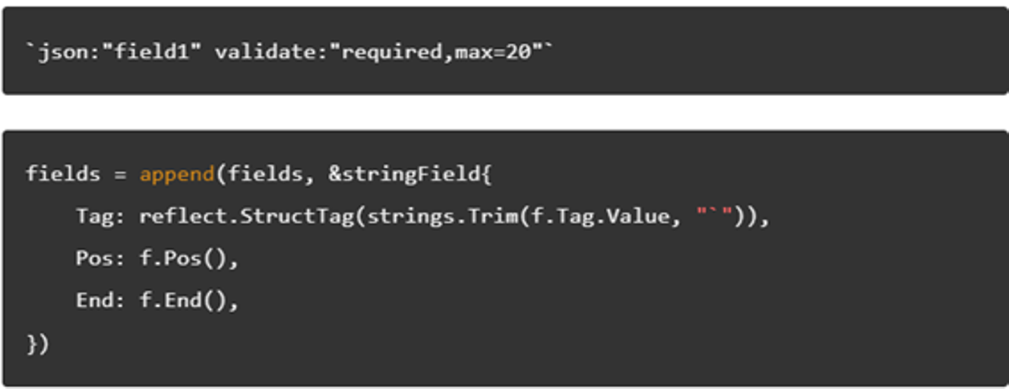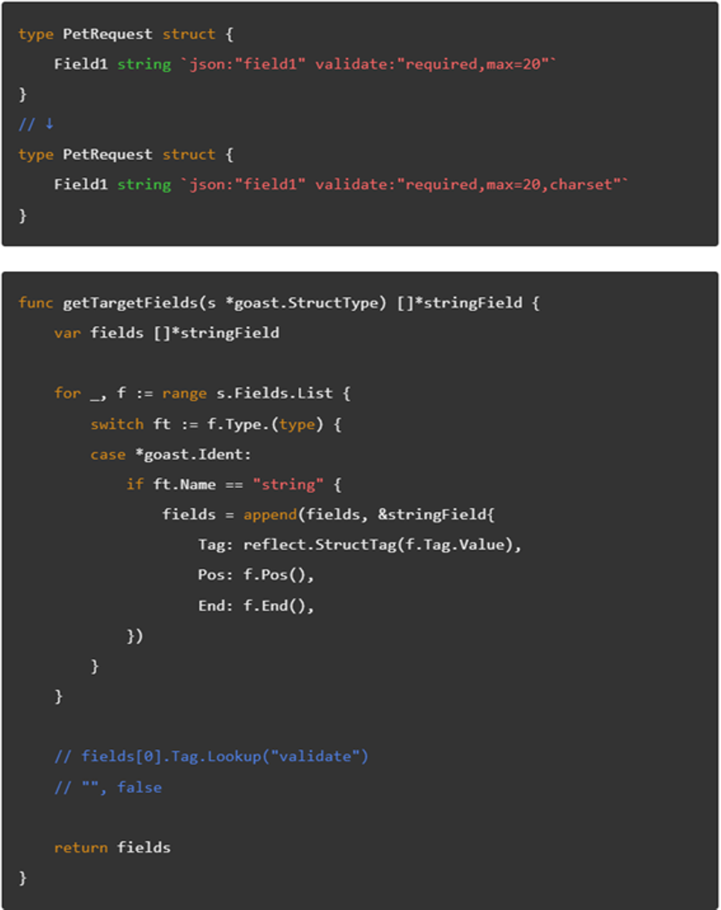 下記のようにvalidateタグがすでにある場合はその最後にタグを追加する必要があった為、 reflect.StructTag.Lookup()で値を取得しようとしましたが、思った通りに取得できませんでした。
