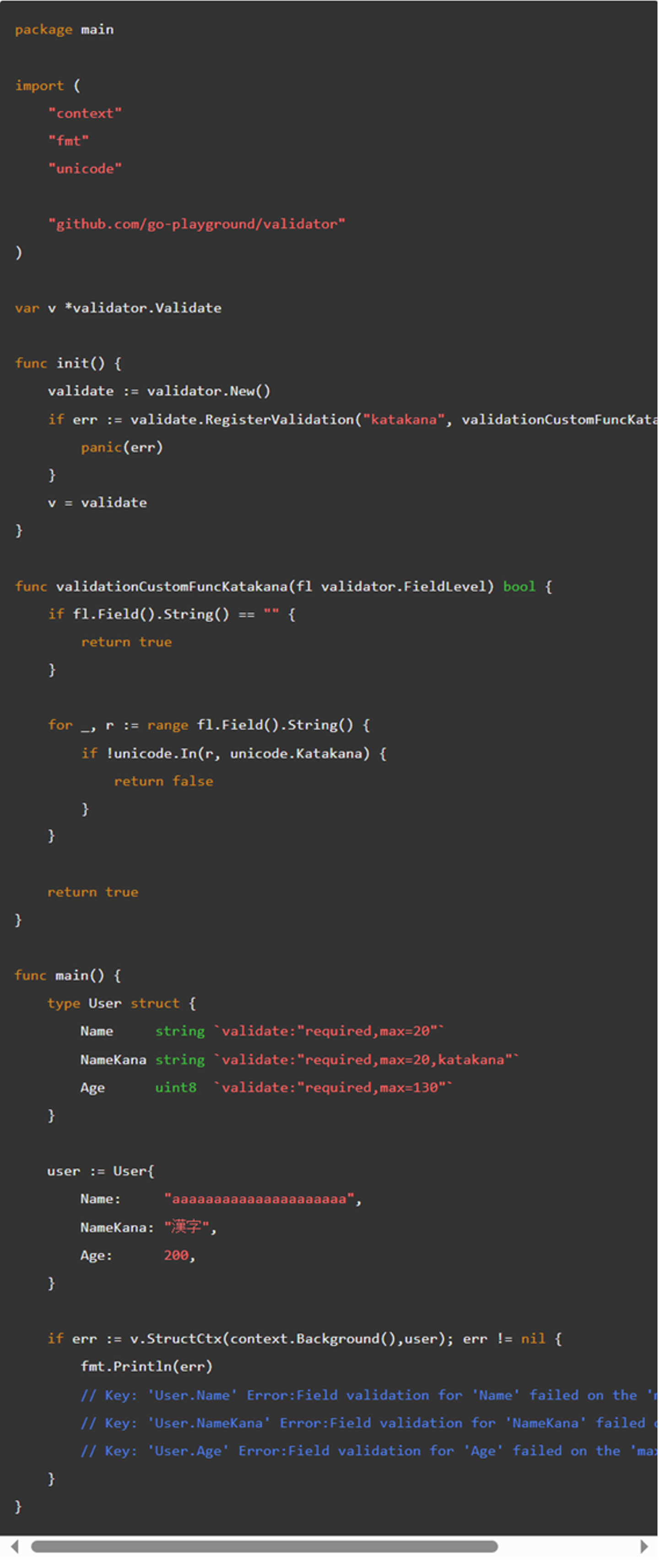 今回利用している、go-playground/validatorでは以下のように独自のバリデーションを追加することができ、発生したエラーをフィールドごとに取得できます。oapi-codegenの生成したコードの構造体タグをカスタマイズできれば、今回やりたいことは実現できそうです。