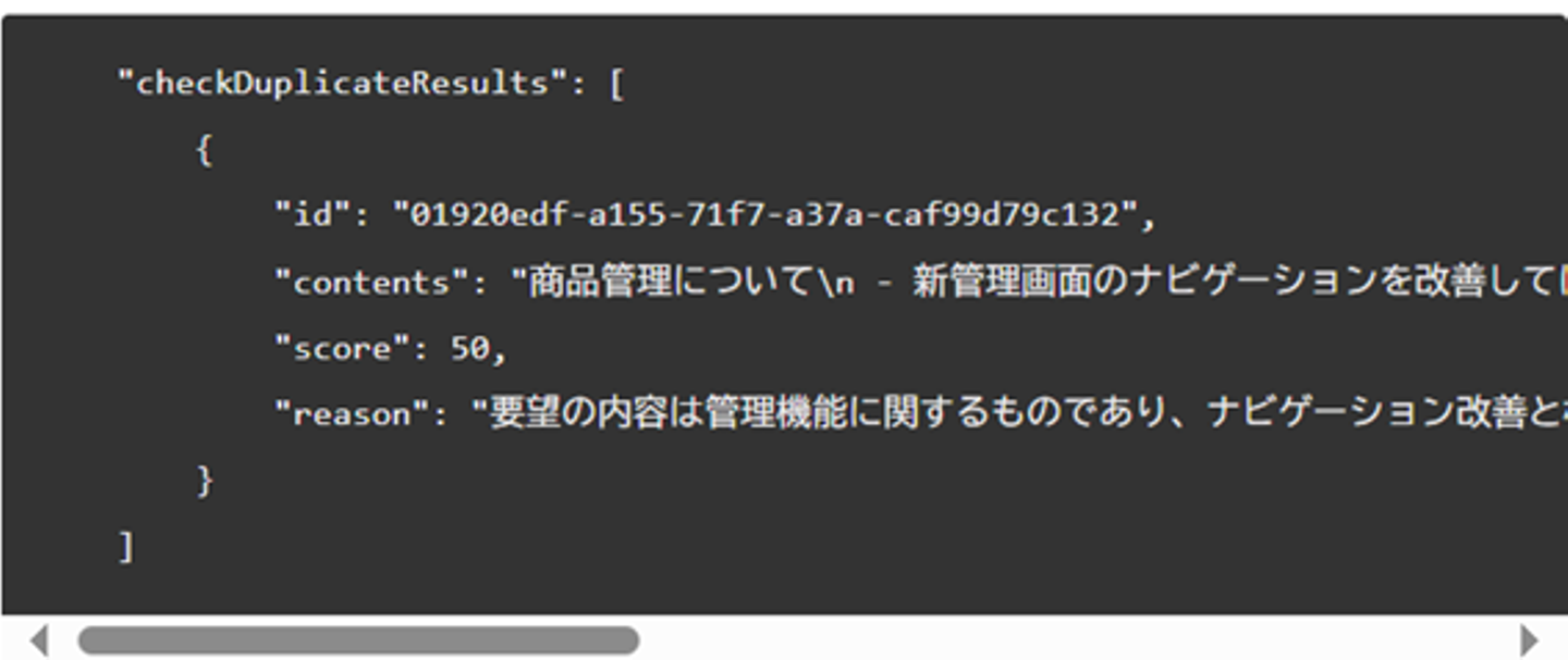{出力結果}には、前述した通り内容の一致度をスコアリングして最もスコアが高い要望を出力するよう指示をしました。スコアの他に識別できるようUID、またAIの判断基準が適切かを検証できるよう類似している根拠も出力するようにしました。