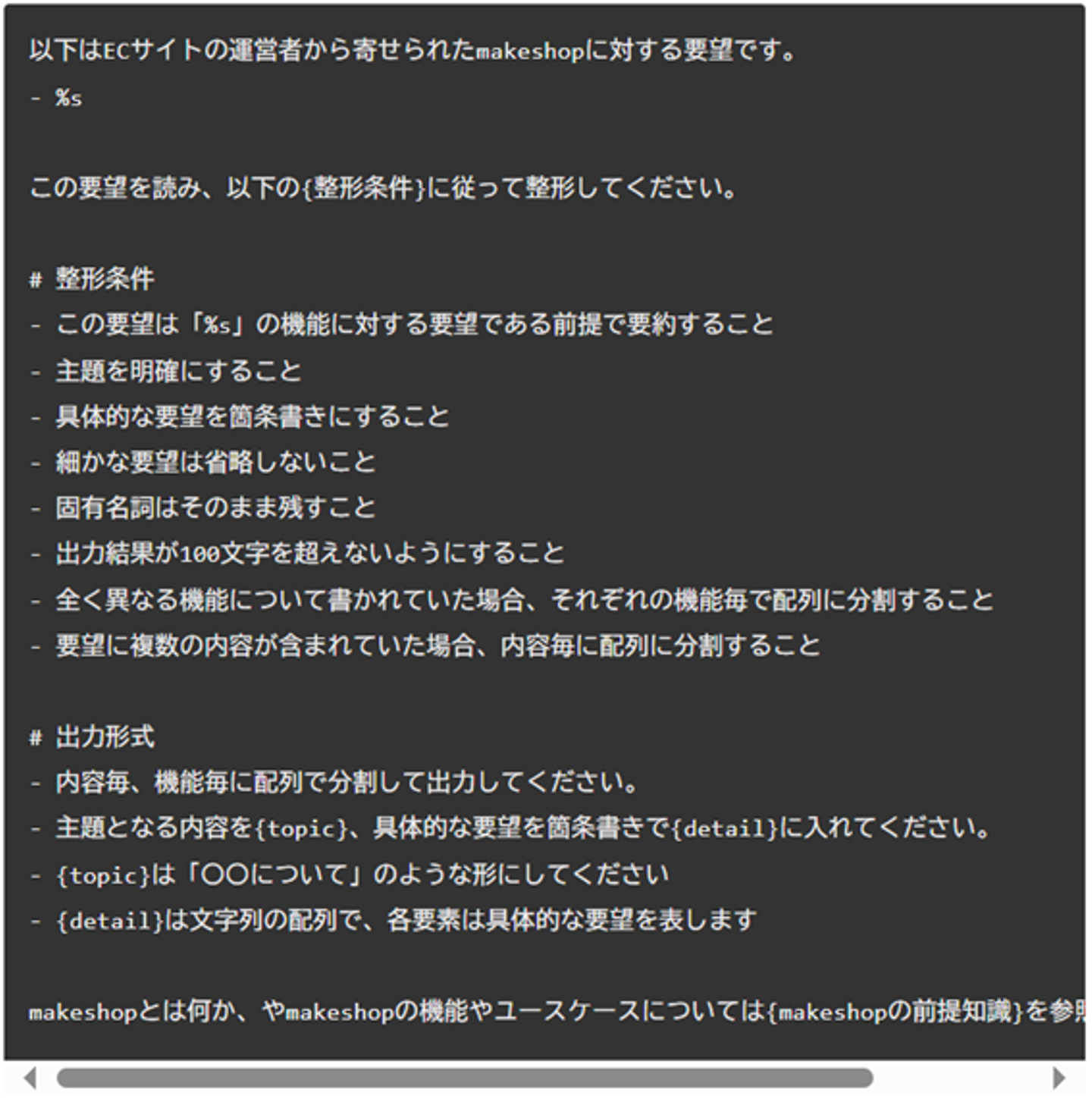 - 要望をAIが自動的に共通フォーマットに要約・整形することで、素早く概要を把握できるようにする。