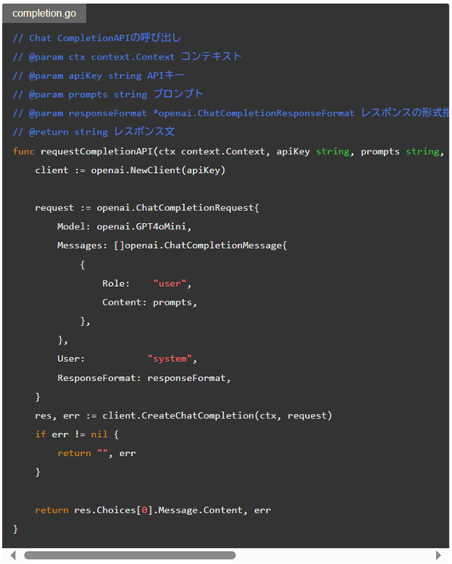 まずAPIの呼び出し部分の紹介です。OpenAIのAPIにリクエストするGoで書かれたメソッドです。