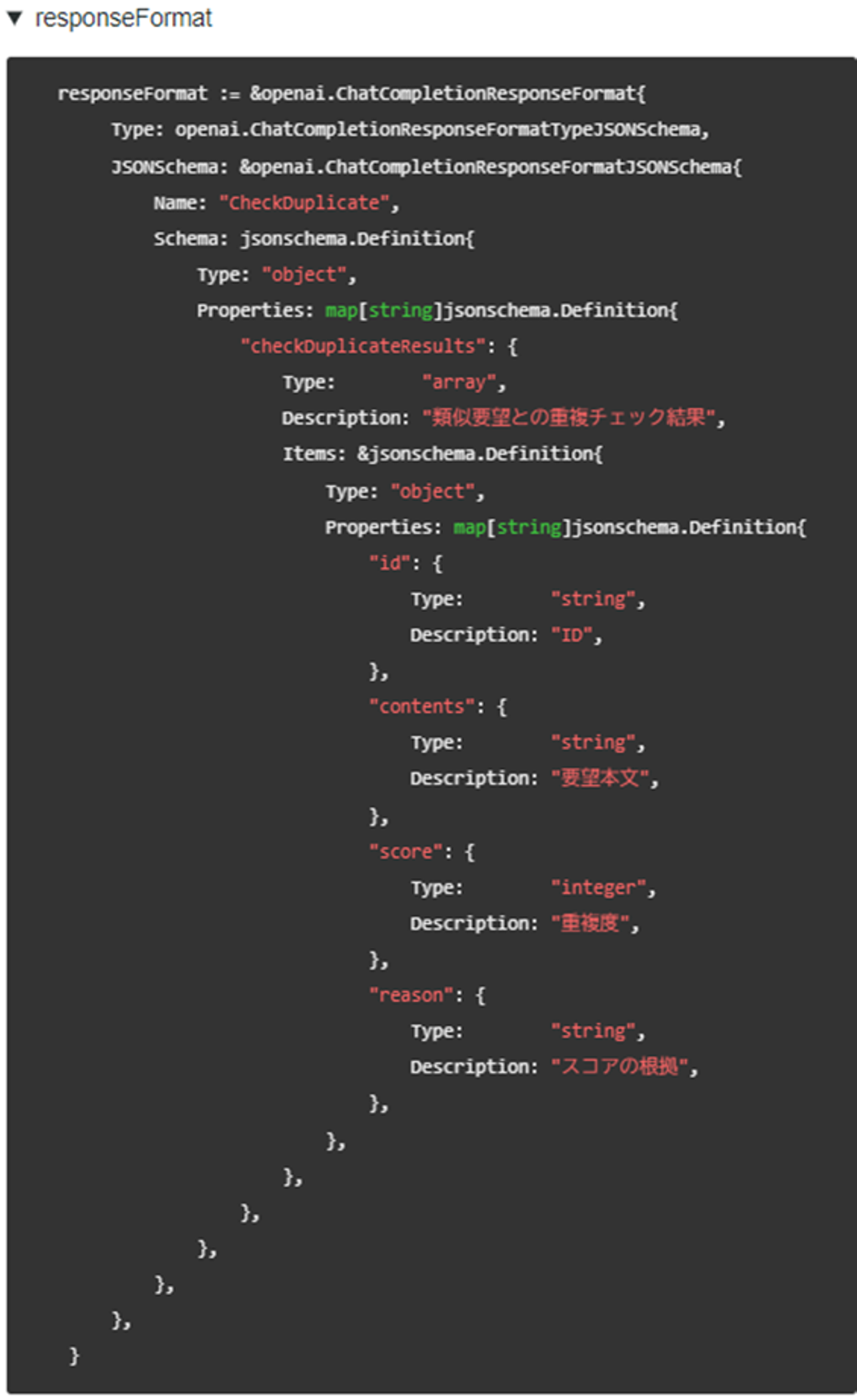 出力結果は jsonオブジェクトの形式で取得するようにしました。レスポンスの形式はAPIリクエストにResponseFormatを含めることで指定可能です。 以下出力結果と使用したResponseFormatです。