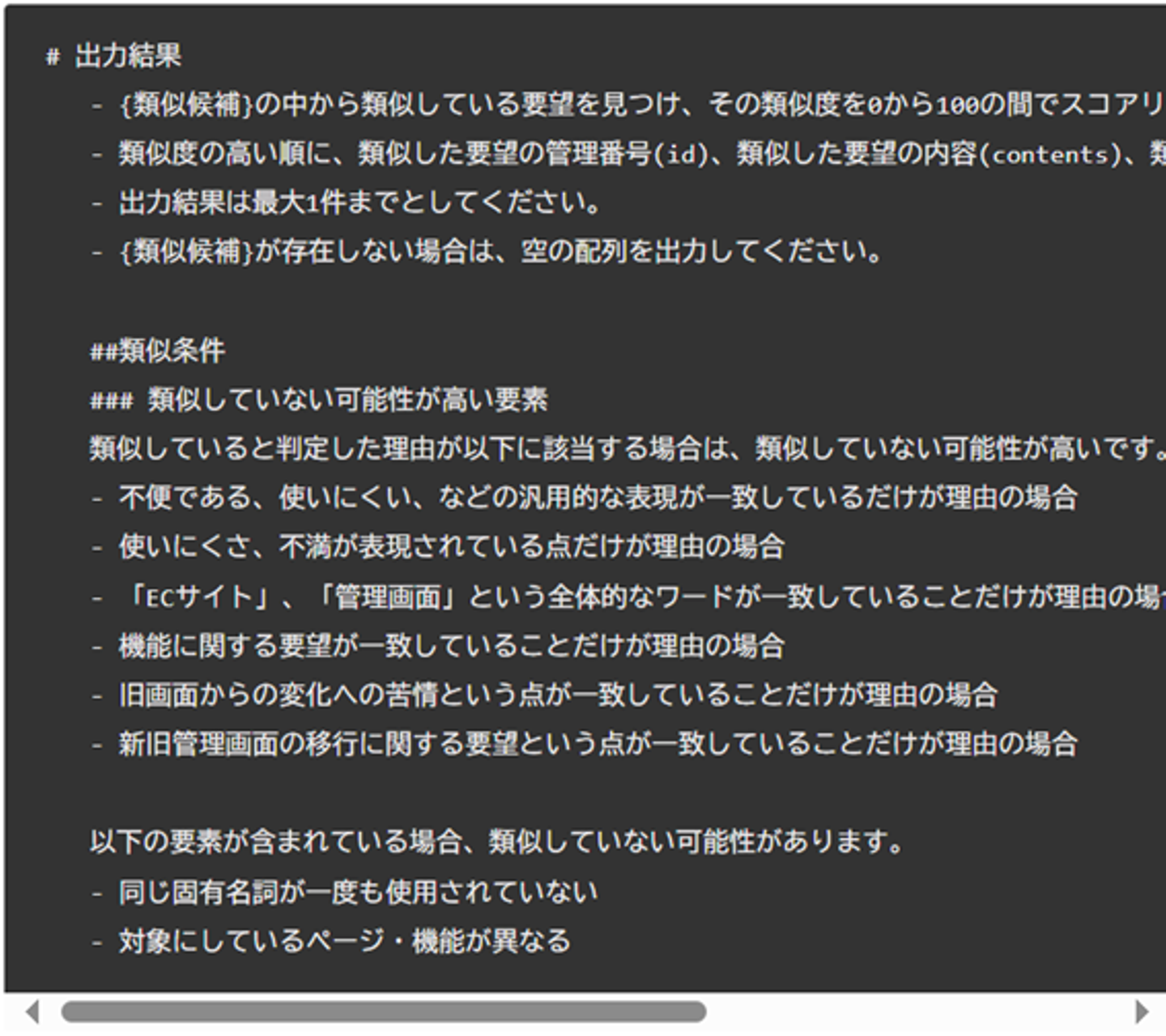 といった大雑把な根拠に基づいて高いスコアが設定されるようになっていました。 そのため、そういった汎用的な表現等は類似している根拠としないよう、プロンプトに追加しました。