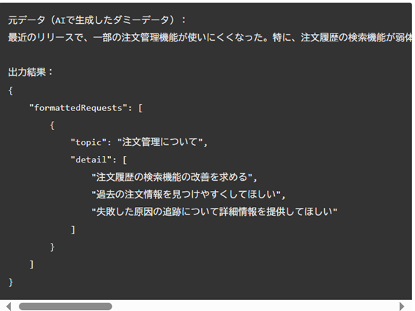 固有名詞など、無くなると要望の根源になりうるものは削除しないようにし、逆に要望に直結しないものについては削除するよう調整しました。容易に概要を把握できるよう共通フォーマットで出力されるようにしています。