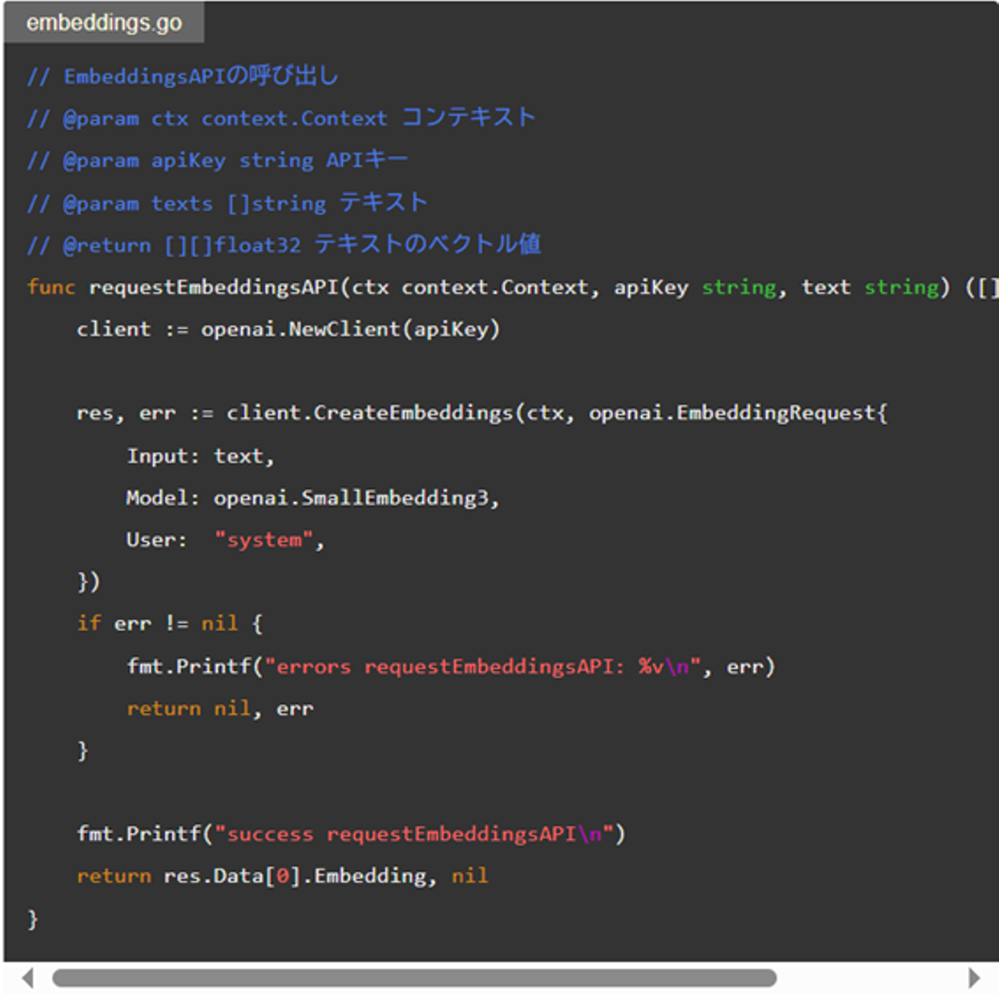 requestEmbeddingsAPI()の引数に要望の本文を使うことで、ベクトルを取得します。