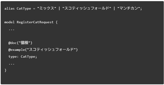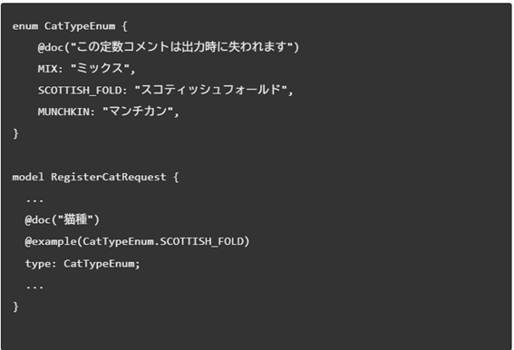 定数一覧を定義できるenumもあります。定数はリクエストのバリデーションとして出力されます。 便利ですが、enumへのコメントはOpenAPIのドキュメント仕様では表現できずビルド時に失われてしまうため注意が必要です。
