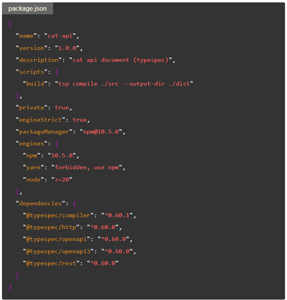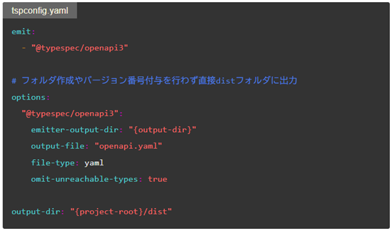 TypeSpecで記述したドキュメントは、Node.jsのTypeSpecコンパイラを使ってコンパイルします。 例として、任意のプロジェクトフォルダで下記ファイルを作成してコンパイルすると、distフォルダ内にopenapi.yamlが生成されます。