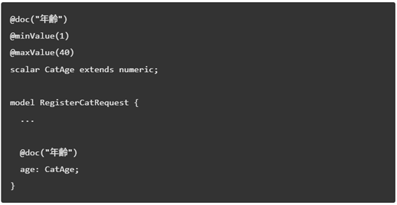 型に対する制約(例: 数値の範囲)を持つカスタム型を定義する際にはスカラーを利用します。 スカラーはモデルと同様にOpenAPIの出力時にコンポーネントスキーマとして出力されます。