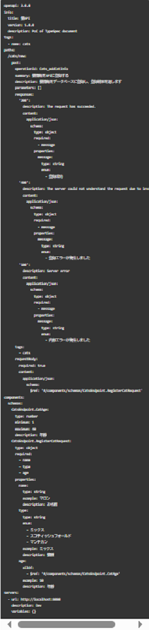 文法を覚えるのにやや慣れが必要ですが、JSONを直接書くよりは、確かに簡単に書くことができました。 リポジトリのREADMEで紹介されていたVSCode拡張機能も正しく動作し、書き心地がとてもよかったです。TypeScriptを使い慣れた方にはぜひおすすめしたい言語だと感じました。 一方で、TypeSpecではOpenAPIで表現できない情報まで記載できてしまい、OpenAPIへの出力時に何が保持され、何が失われるかわかりづらい点は少し懸念でした。