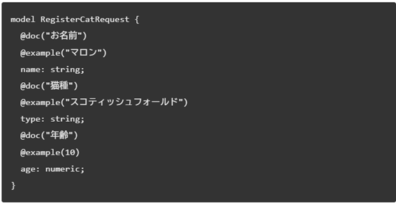 リクエストやレスポンス等の構造を定義するためにはmodelキーワードを使用します。モデルはOpenAPIの出力時にコンポーネントスキーマとして出力されます。