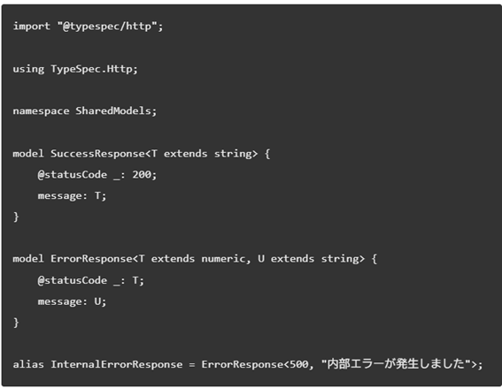 ジェネリクスの機能は、ほとんどTypeScriptと同様の書き方で利用できます。 TypeSpecでの数値はnumber型ではなくnumeric型と記載する点に注意が必要です。