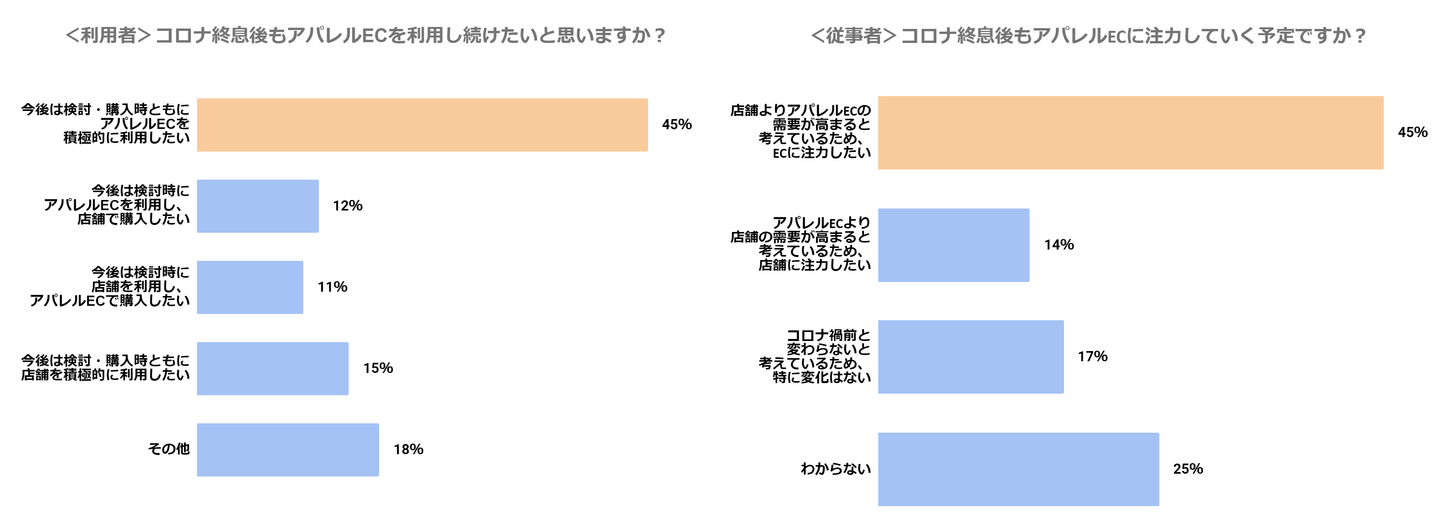 本調査では、アパレルEC利用者がコロナ終息後のアパレルECの利用において、「今後は検討・購入時ともにアパレルECを積極的に利用したい」が45%と最多であり、またアパレル企業従事者も自社ECの意向について、「店舗よりもアパレルECの需要が高まると考えているため、ECに注力したい」が最も多く、45%を占めました。これによりコロナ終息後もユーザーはアパレルECを継続して利用する意向があり、またアパレル企業もEC施策を強化したいと考えていることがわかりました。