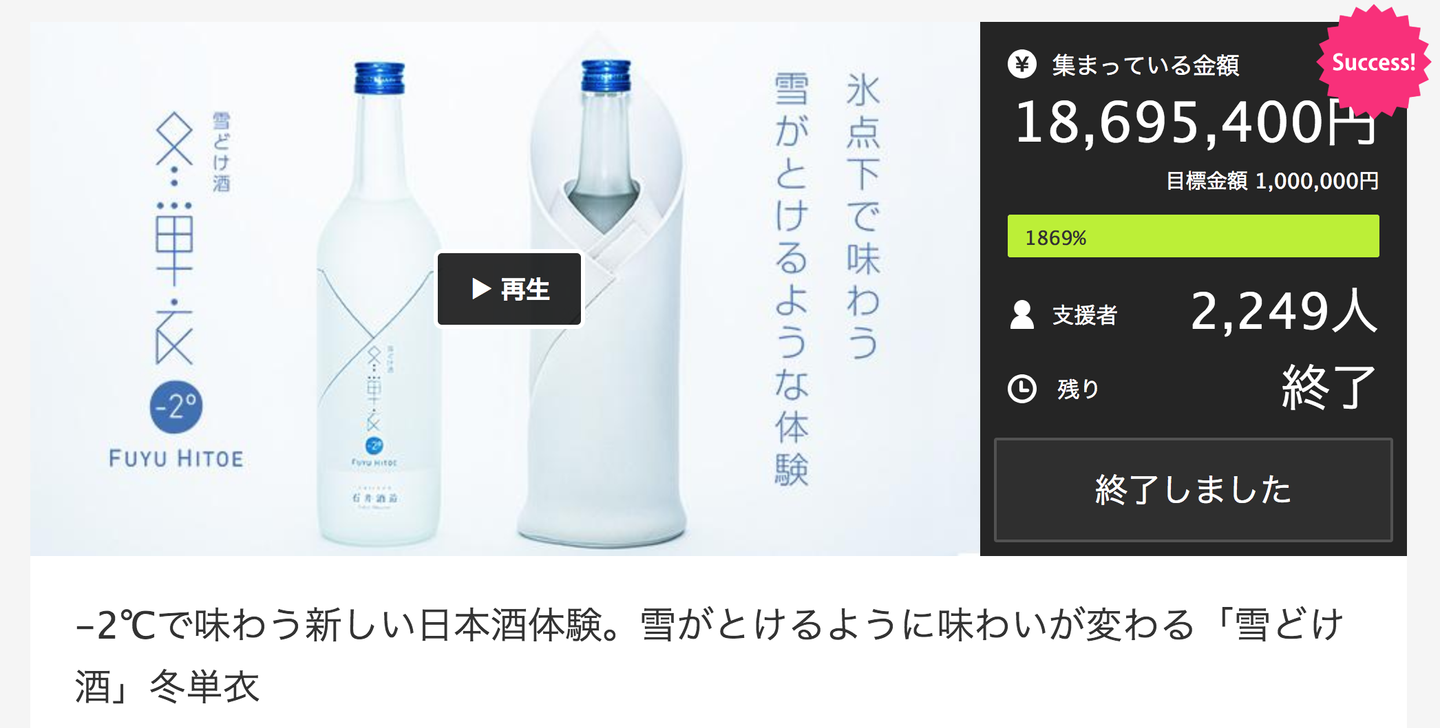 仮説が確信となったのは、シャープさんと取り組ませていただいた事例です。液晶技術を応用して7年ほどの研究開発から生み出された「-24度〜28度の狙った温度をキープし続ける」という特殊な蓄熱材料。活用用途を拡大していくために、価値検討段階からご相談をいただき共同で新商品プロデュースを行いました。僕らが参画することで、埼玉の老舗酒造とマッチング。マイナス2度で味わう日本酒「雪どけ酒・冬単衣(ふゆひとえ)」を商品化しました。酒造さんと共に「冬単衣(ふゆひとえ)」という商品のネーミングや、「雪どけ酒」というコピーを考案し、Makuakeのサイトに掲載する動画や写真の撮影・制作やページのクリエイティブ監修も我々が担当しました。結果的に、3000本用意した日本酒が3か月で完売し1800万円を集めただけでなく、たくさんのメディアにも取り上げていただくことができました。