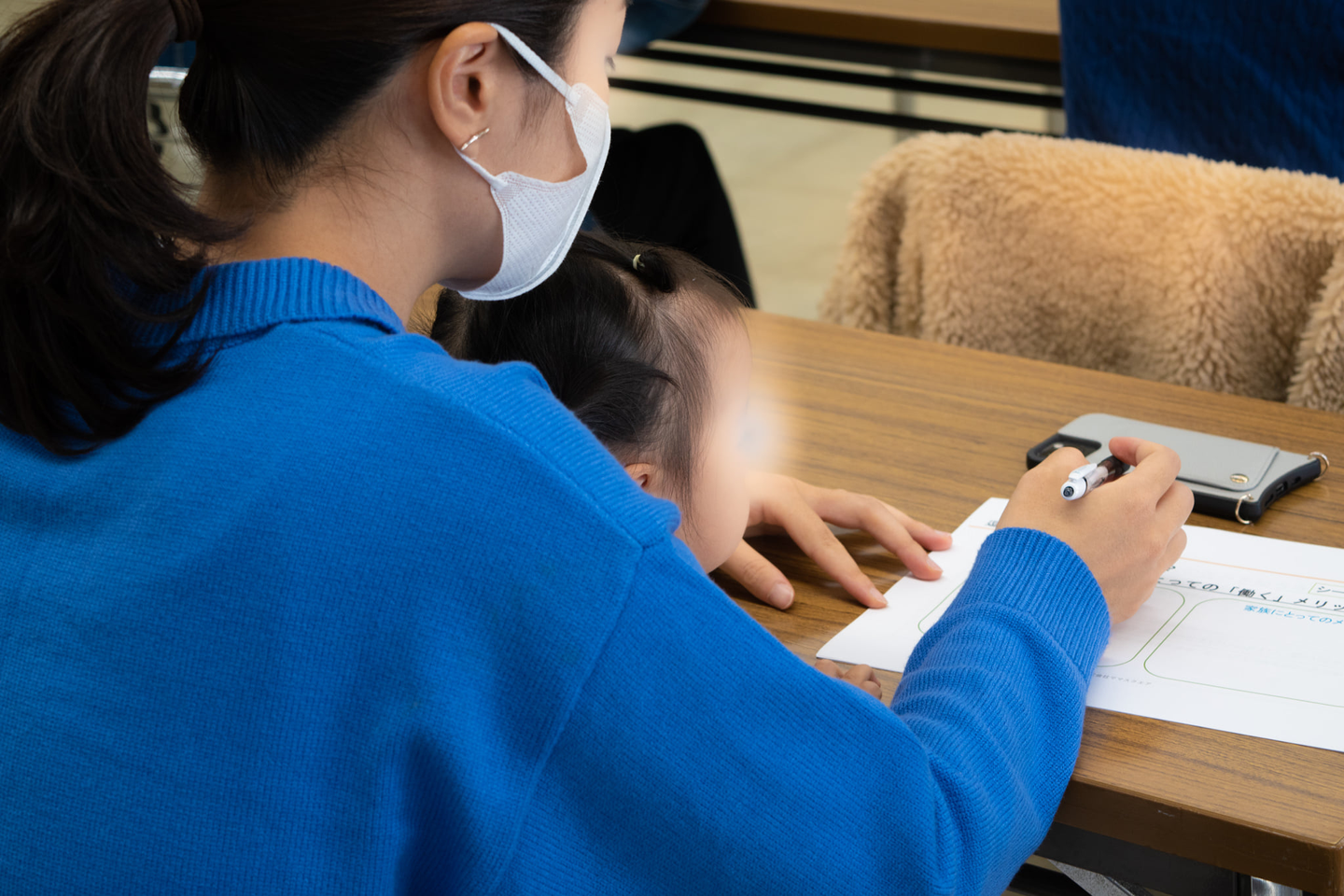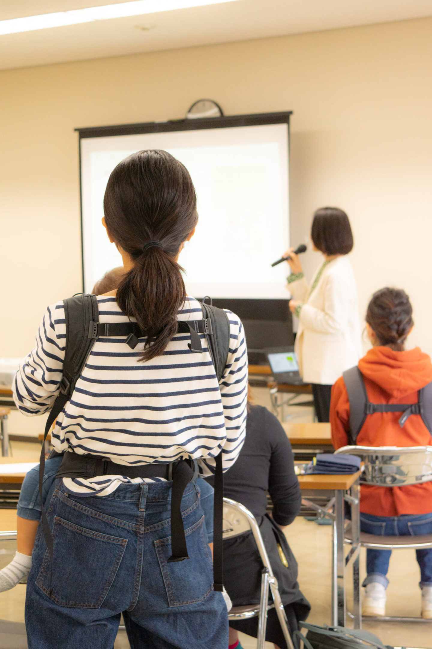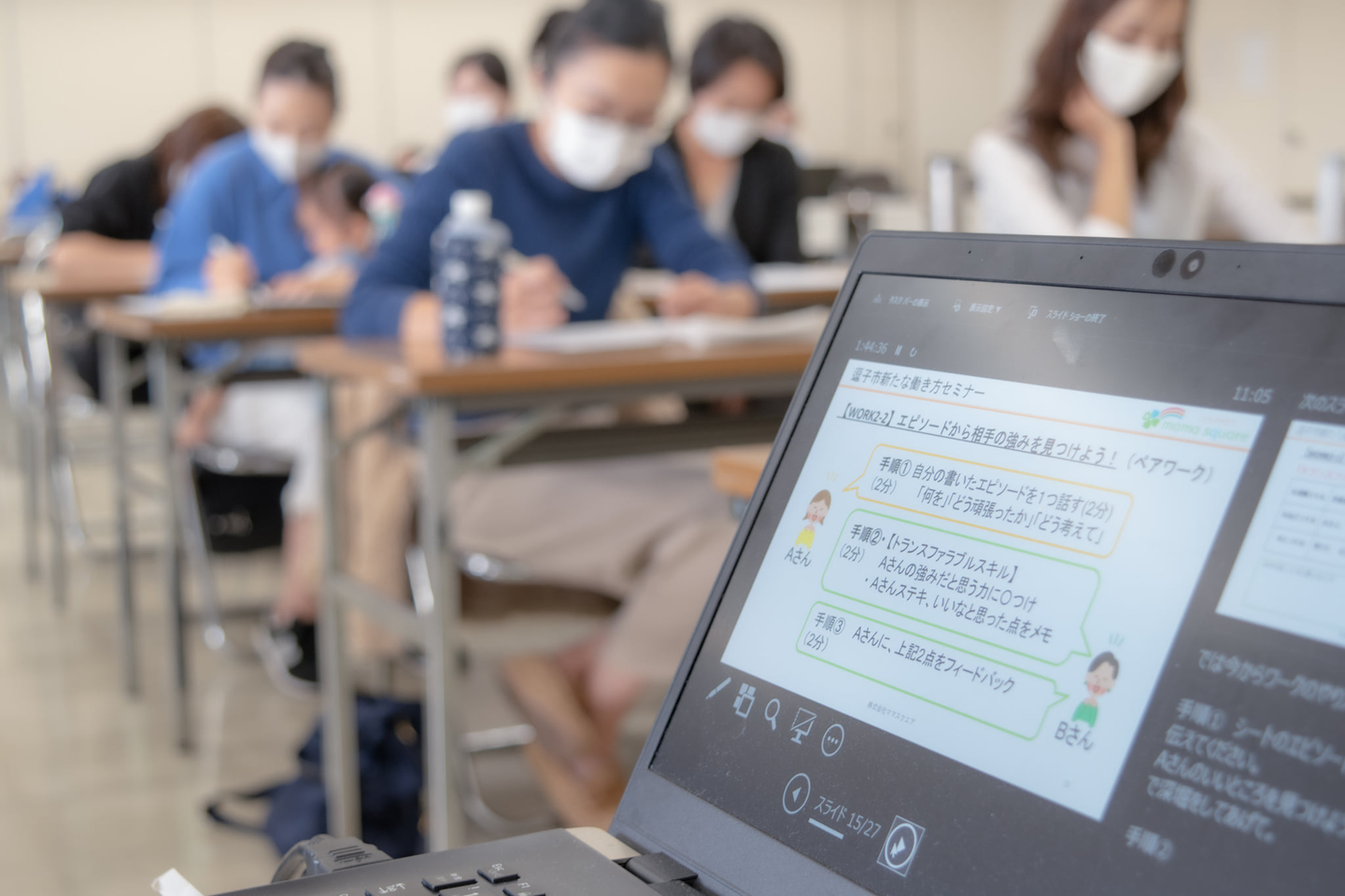 ママスクエア主催の会ですので、ベテランキッズスタッフを配し、子連れでご参加いただいたみなさまに集中して受講いただける体制を整えました。中にはわが子をあやしながら講師の話に聞き入る姿もあり、微笑ましいと同時に真剣さを目の当たりにしました。子育てに忙しい生活の中で「自分のキャリア」に向き合えた時間になったのではないでしょうか。