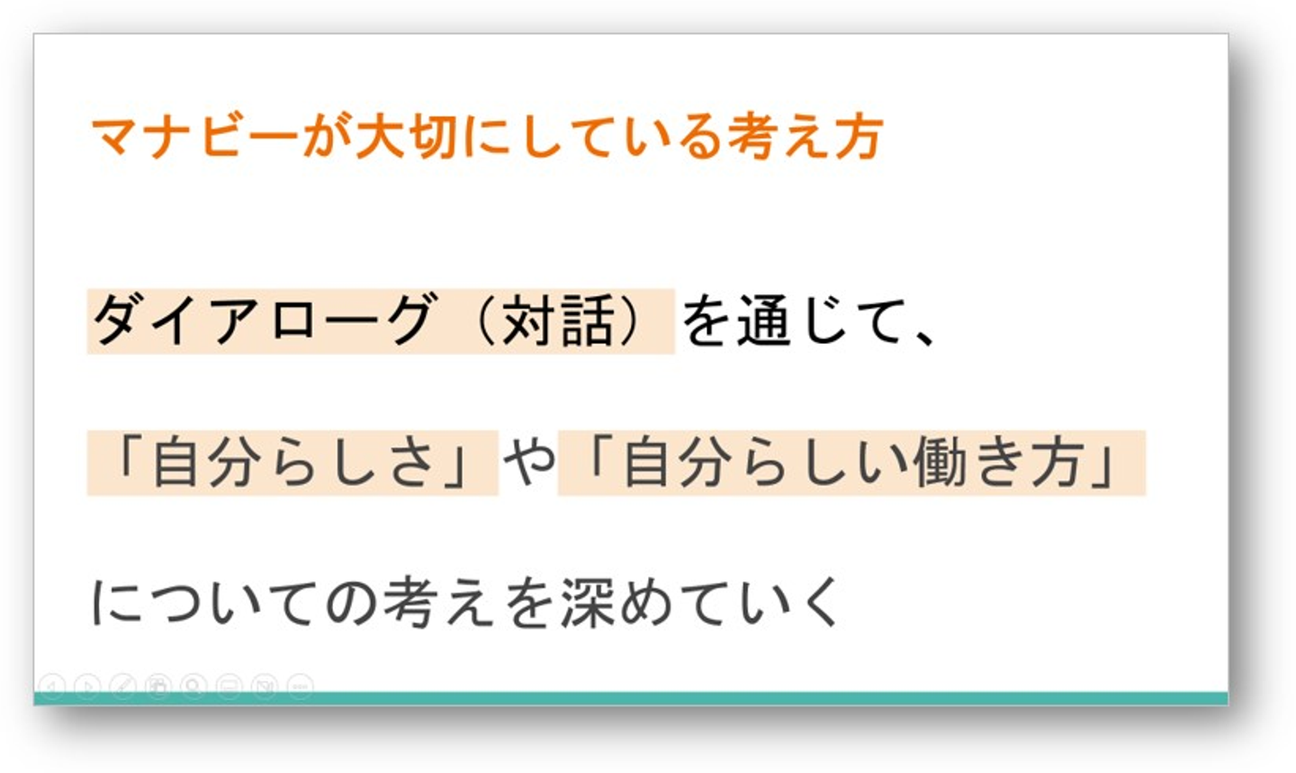 manaby(マナビー)が創業まもない頃から大事にしているダイアローグ。スタッフは研修や勉強会を通して学んでいますが、全国それぞれの事業所でも支援現場で実践しながら、日々鍛錬しています。