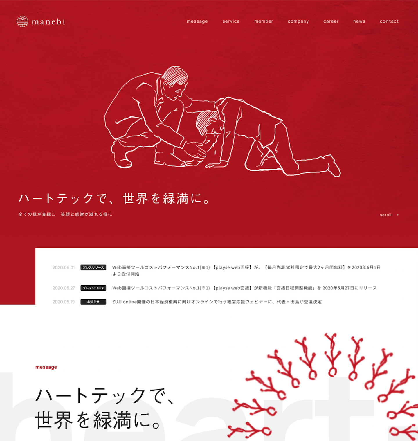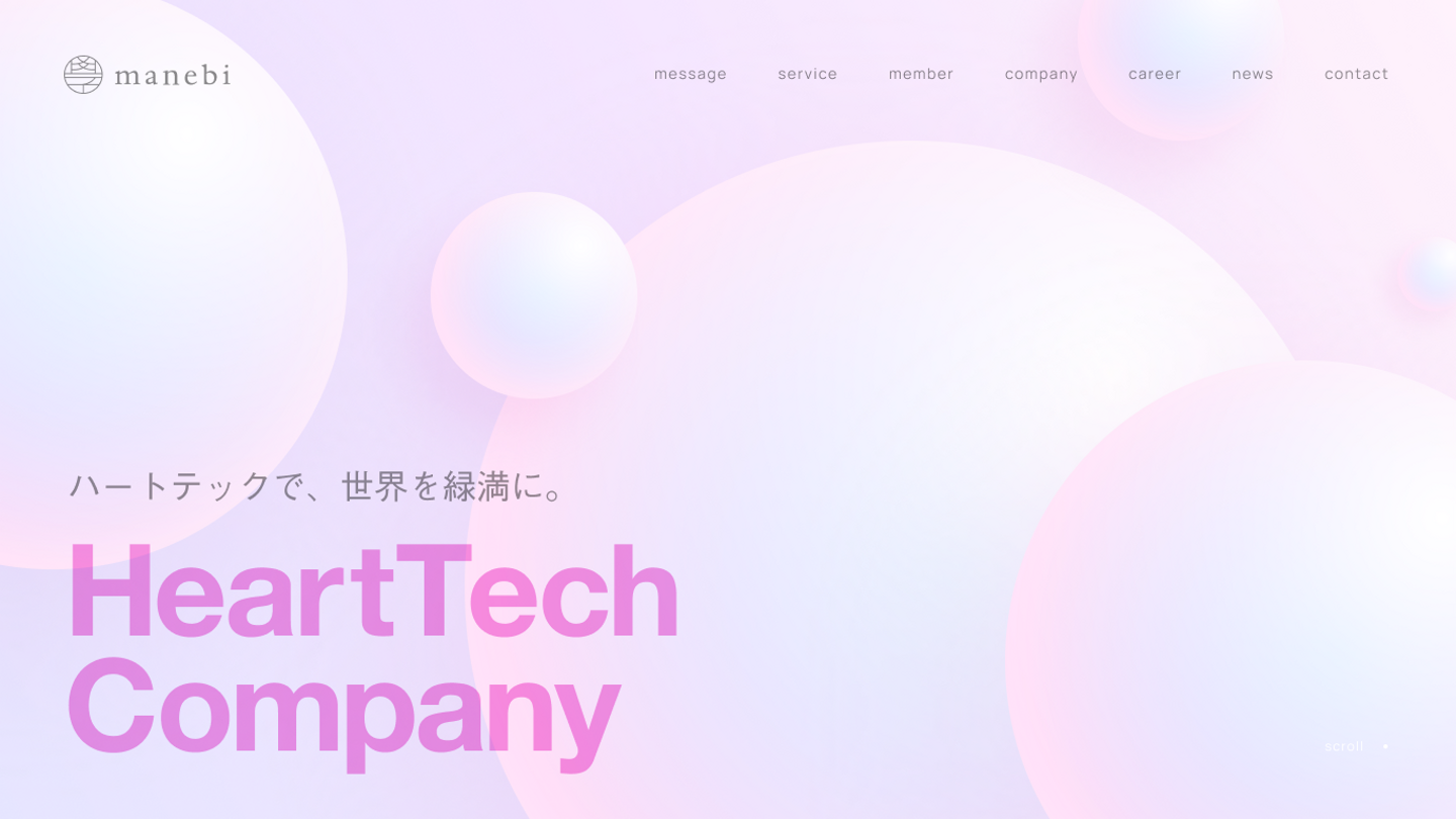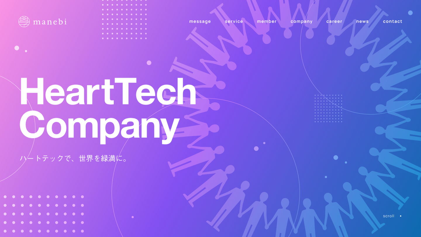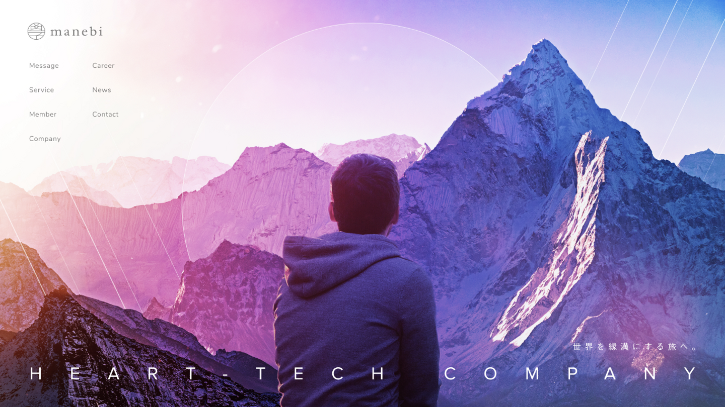 今回のコーポレートサイトリニューアルは、manebiのミッションである「世界縁満」だけでなく、我々が目指す「HeartTechカンパニー」というコンセプトを打ち出すデザインへ変容することが目的となります。