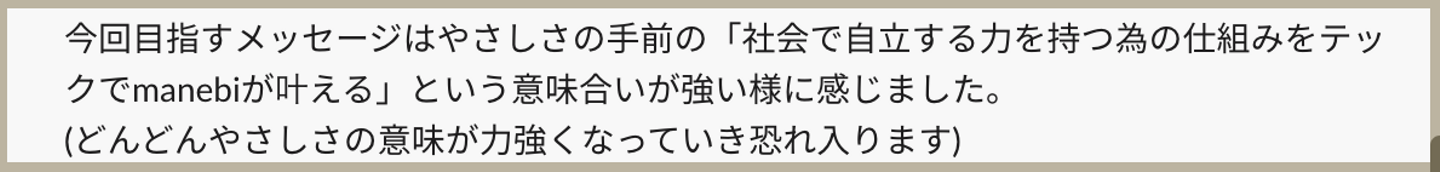 このような会話はmanebiでは節目節目でなされており、当たり前のように考えたことのある議題です。