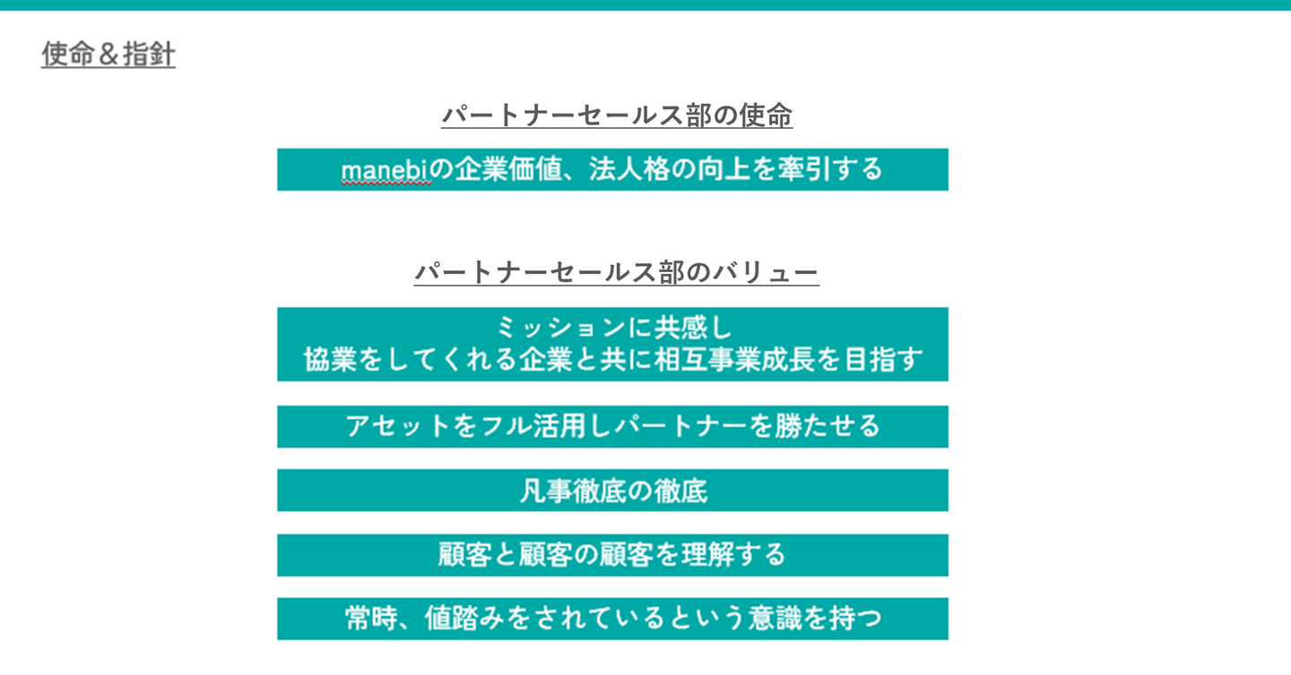 先ほど部署の役割でもお話した通り、Webマーケティングだけではプロダクトをお届けできる顧客層などが限られてしまいます。様々な企業様と組むことによって、より多くの方にプロダクトをお届けしてビジョンを実現することができると思うので、会社と同じビジョンをパートナーセールス部としても掲げています。