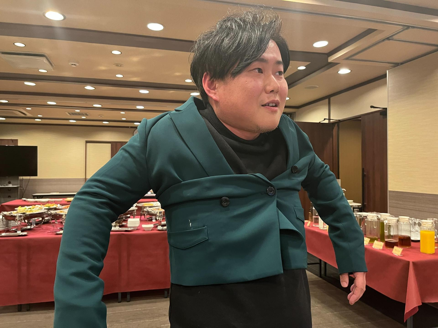 ※忘年会で若手メンバーにジャケットを着させられている写真。なぜ??笑