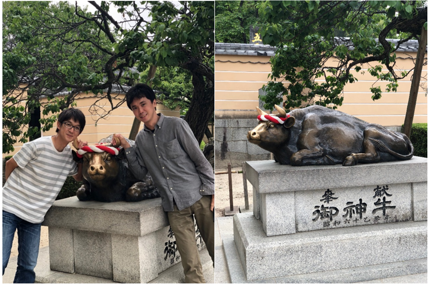 境内に入りまず現れたのが「御神牛(ごしんぎゅう)」です。撫でた部分の病気が治り、頭を撫でれば賢くなるとされているので、より賢くなってもらいたいCSと開発メンバーに角をガッツリ握ってもらいました。
