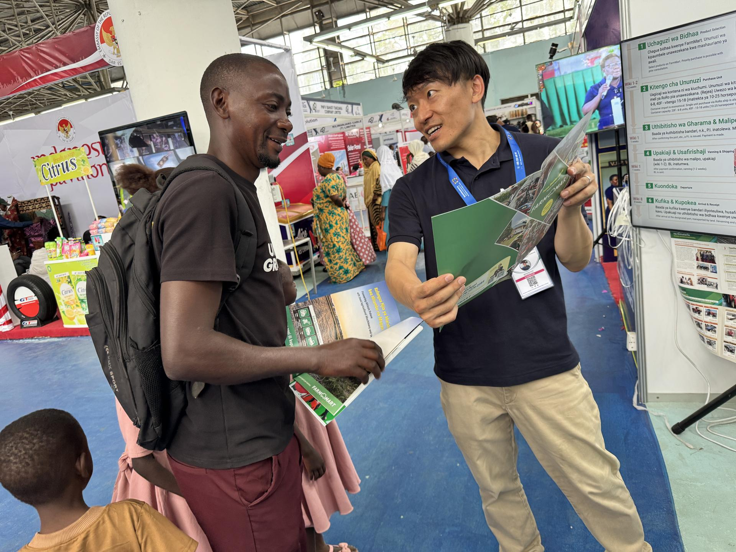 MEのブースでは、実際に日本から輸送したトラクターと手押し耕運機を展示。その他、事業内容を説明する動画やパネルを設置し、来場者にはスワヒリ語で作成したクリアファイルとパンフレットを配布しました。