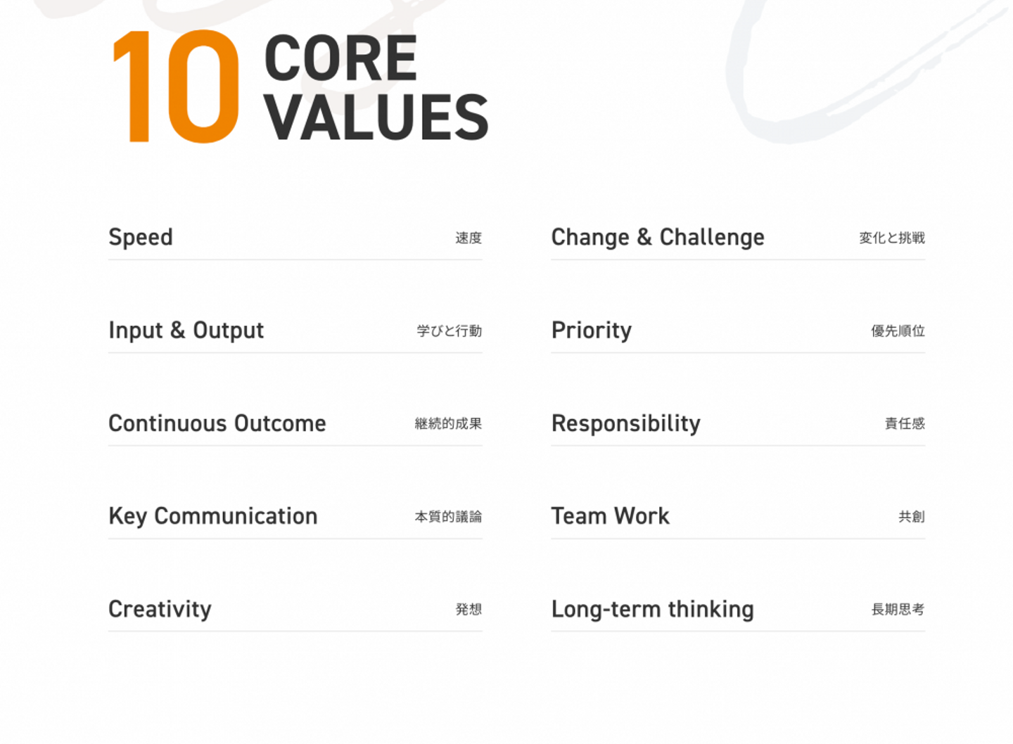 MEでは、自社の行動指針の「10core values」があります。私が経験した企業はMEのみですが、これはどこへ行っても通用する指針であると気付かされました。
