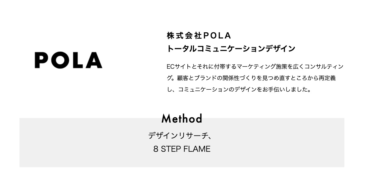 株式会社POLAさまとは、他社のナショナルクライアントさまのデジタル部門トップの方からのご紹介をきっかけに、CRMの戦略コンサル支援から始まりました。mtc.の独自メソッドである8 STEP FLAMEを用いてCRMの戦略構築からコミュニケーションの関係性づくりのあり方などから見つめ直し、再定義しました。現在では戦略コンサルから一連のマーケティングまで年間でご支援しています。