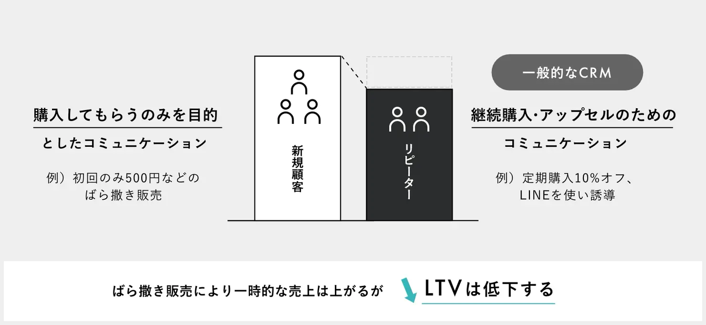 新規は新規で獲得の「件数」を重視した訴求に。リピーターはリピーターでよりサービスを使ってもらおうと考え「質や量」を重視した訴求に。と、バラバラなコミュニケーションを取ることで、割引に惹かれたユーザーは「ちょっと違うな」と感じるでしょう。その結果、新規顧客は購入後すぐに離れ、LTVを含む各種指標にも悪影響を与える可能性があります。