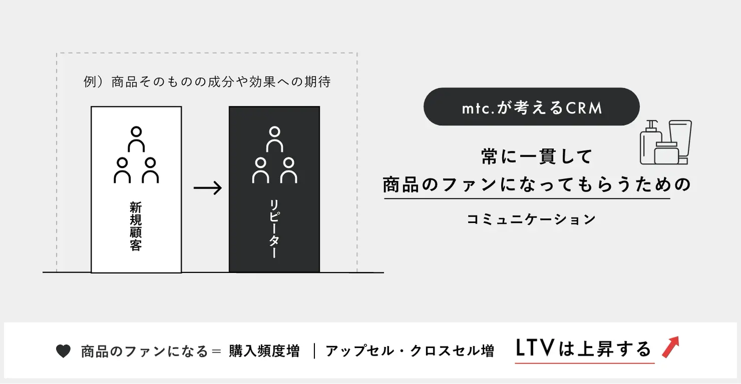 私たちmtc.は、ユーザーと接点を持った時点からあらゆるフェーズにおいて統一したコミュニケーションを実現し、顧客との関係を維持・向上させることこそが、企業が取り組むべき本来のCRMであると考えています。そのためには、単なる施策の積み重ねではなく、一貫性のあるアプローチが欠かせません。