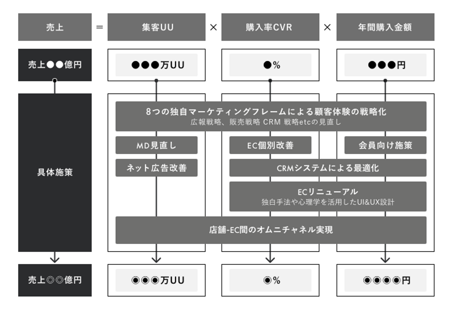 定量・定性分析やGDM®の作成・現状のコミュニケーション内容の精査内容を踏まえ、「何から着手すべきか?」を明確にし、適切なKGI・KPIを設定したうえで、CRM全体の戦略を策定します。