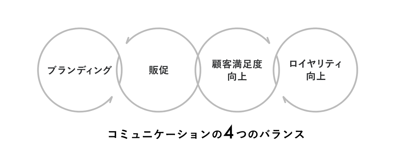 CRMにおける顧客とのコミュニケーションは、大きく分けて 「ブランディング」「販促」「顧客満足度向上」「ロイヤリティ向上」 の4つの目的があります。この4つのバランスを均等に保つことが重要だと私たちは考えています。