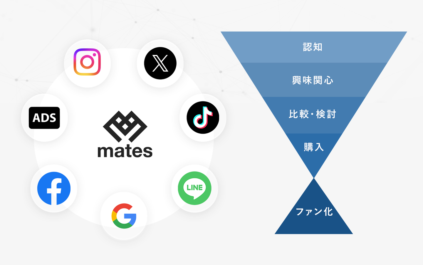 MATESのマーケティングで特徴的かつ強みなのが「フルファネルマーケティング」。一気通貫のフルファネルマーケティングができることに加え、そこにSNS活用を交えて提案ができる会社は他にほとんどありません。