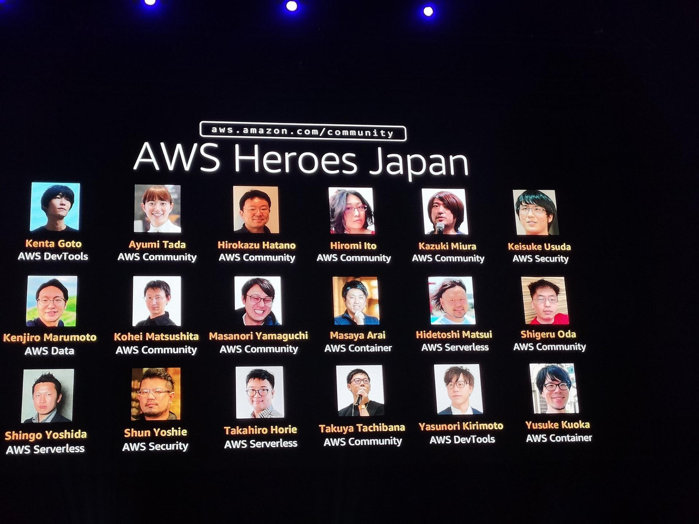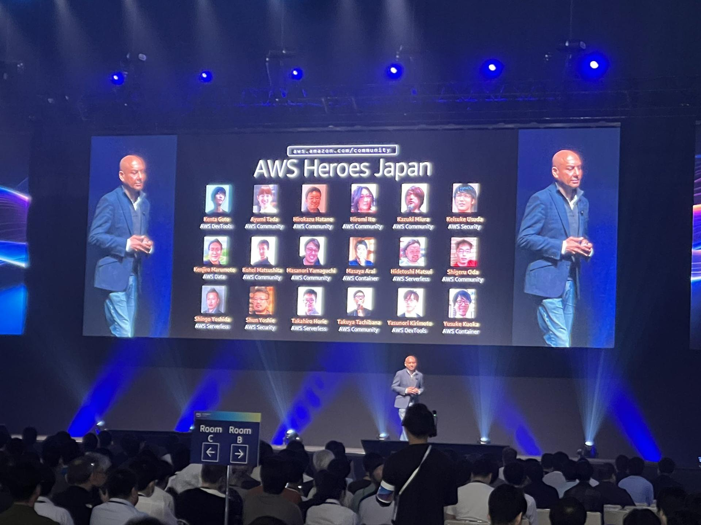 というのも、私は「AWS HERO」というAWSコミュニティでのグローバルな表彰制度に選出いただいており、そんなAWS HEROのうち日本から選出されている方々を基調講演の中でご紹介いただくというサプライズがあったのです!