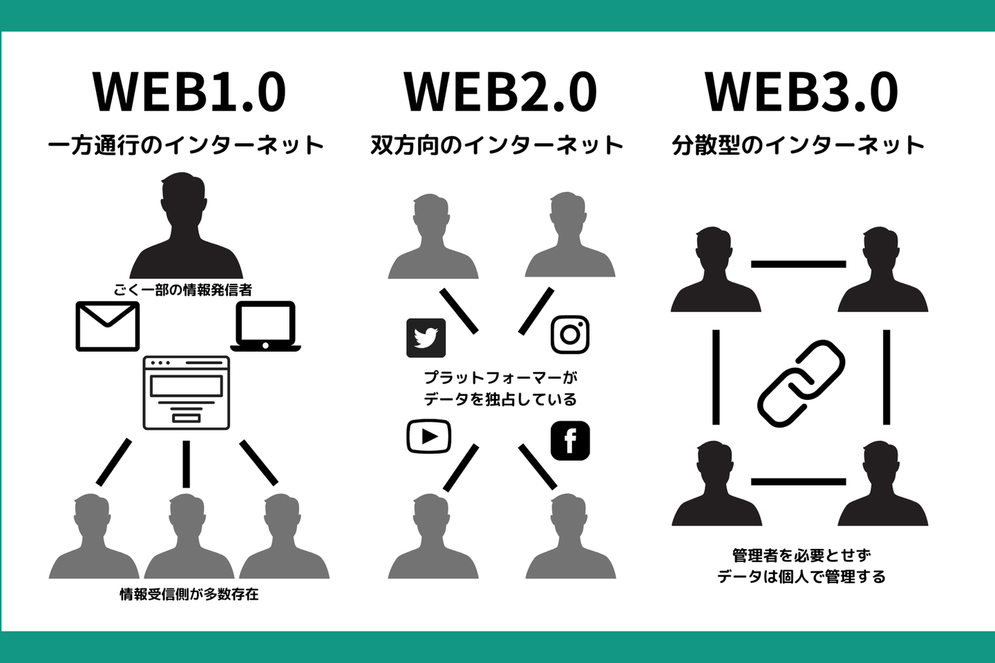 特定のプラットフォーマーに依存することなく、ブロックチェーン技術によってデータを個人に分散させる」ことを目指したインターネット概念を指します。つまり巨大テックのプラットフォームを介さずに、ユーザー同士で直接、データやコンテンツ、お金のやり取りができること。