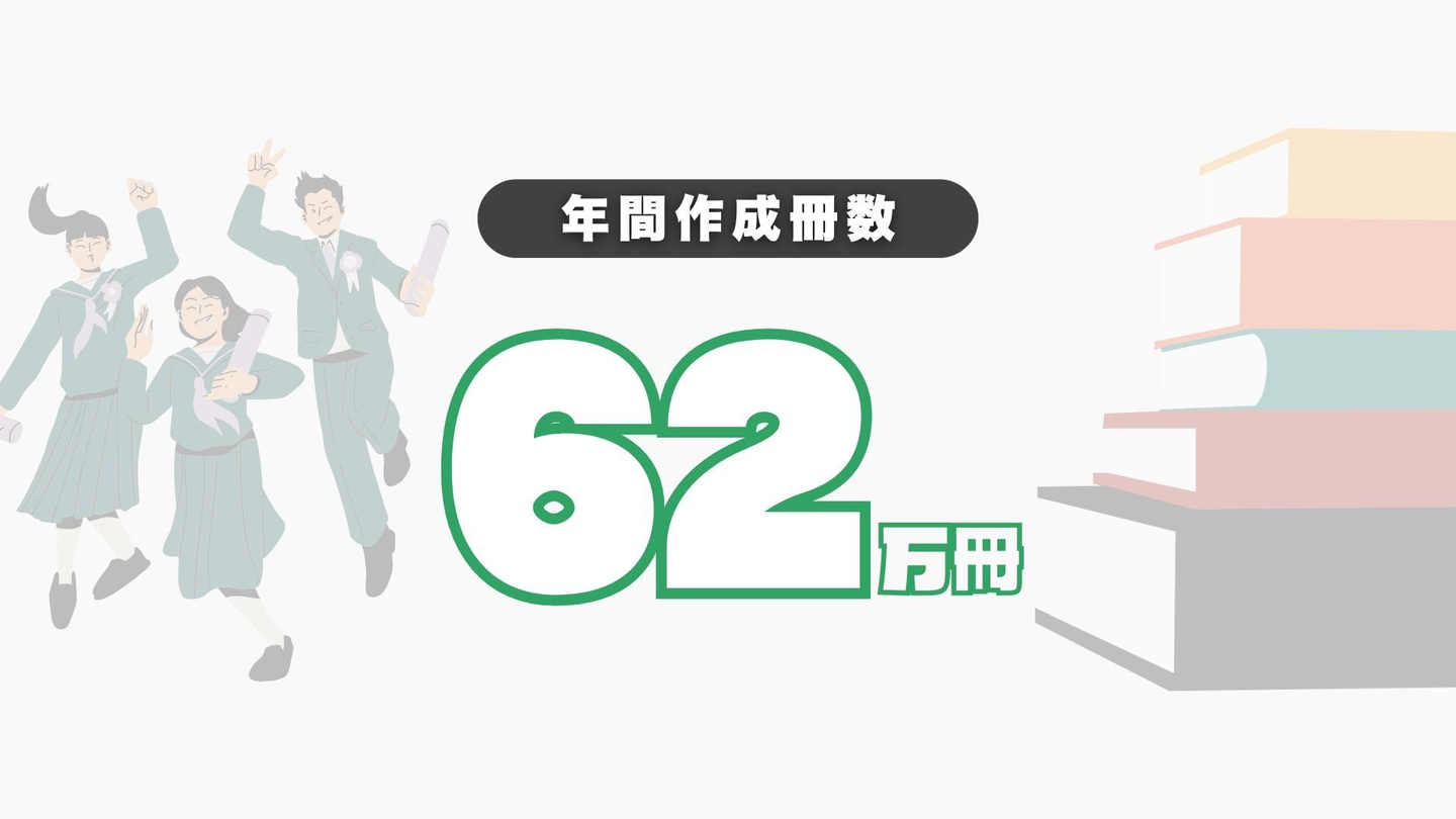 マツモトは、「卒業アルバムと言えばマツモト!」という、長い間培った信用と業界での知名度を確立しています。年間作成冊数は、なんと……62万冊!!全国の地域の写真館と一緒に、日本中の学生たちの記憶に残る大切な仕事をさせてもらっています。