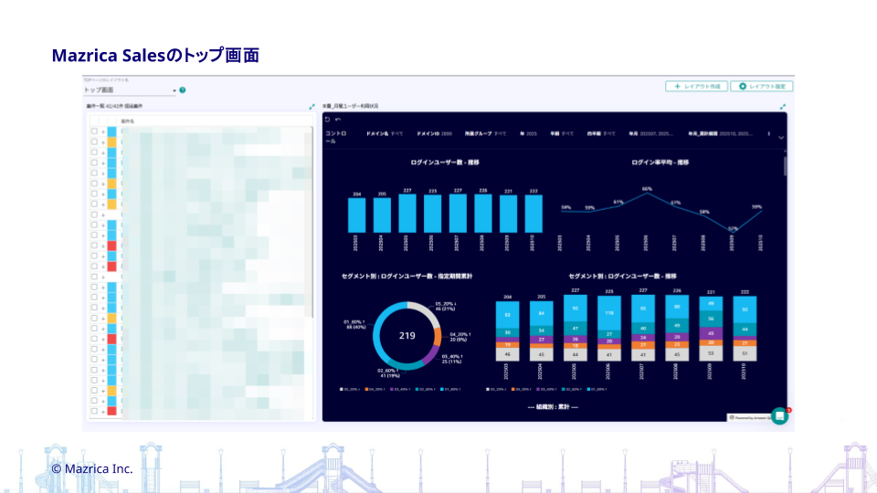 Mazrica Salesのトップ画面には、担当する約40社の利用状況を一覧で確認できるBIを自分で組み込んでいます。各社のログイン率、データ登録数の推移を見ながら、「この変化の背景には何があるのか」を考えるのが私の朝の始まりです。